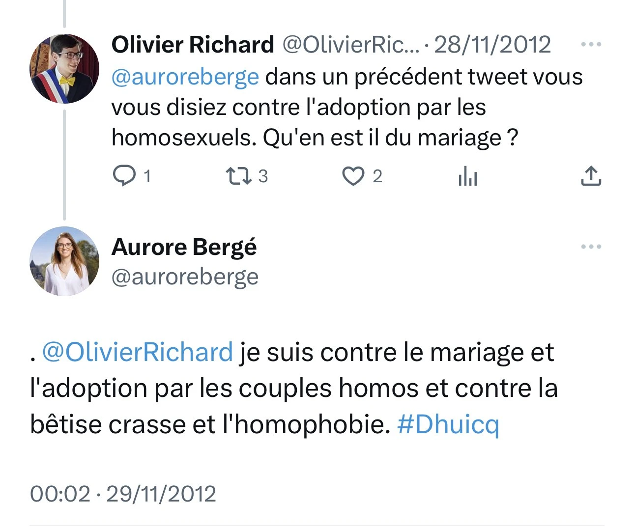 Aurore Bergé, députée des Yvelines et Renaissance, martelait elle aussi fin 2012 être “contre le mariage et l’adoption par les couples homo” sur son compte Twitter.