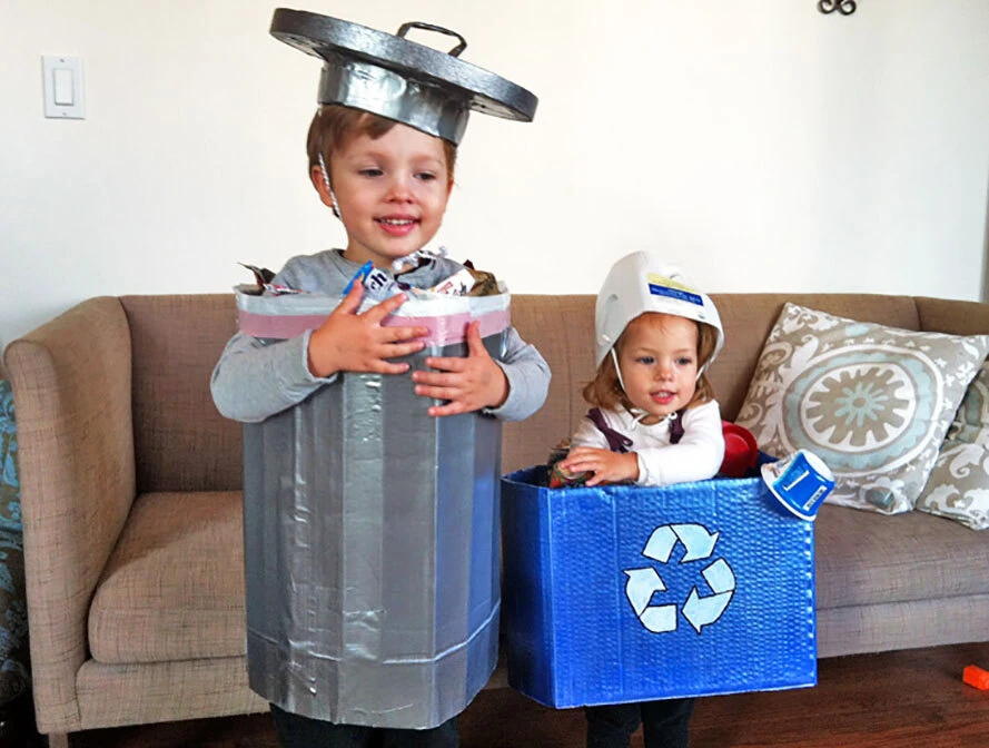 Beau message à envoyer. Surtout si vous décidez d’en déguiser un des deux en bac à recyclage. Y’a de l’espoir pour un, mais pas pour l’autre, hein? Après tout, la mode est au zéro déchets, non ? Déguisez-donc votre enfant en bocal “Le Parfait” à la place. Bon, OK, le concept est un peu plus difficile à expliquer, mais, au moins, Mathis n’aura pas la ferme impression qu’il est une corvée pour vous.