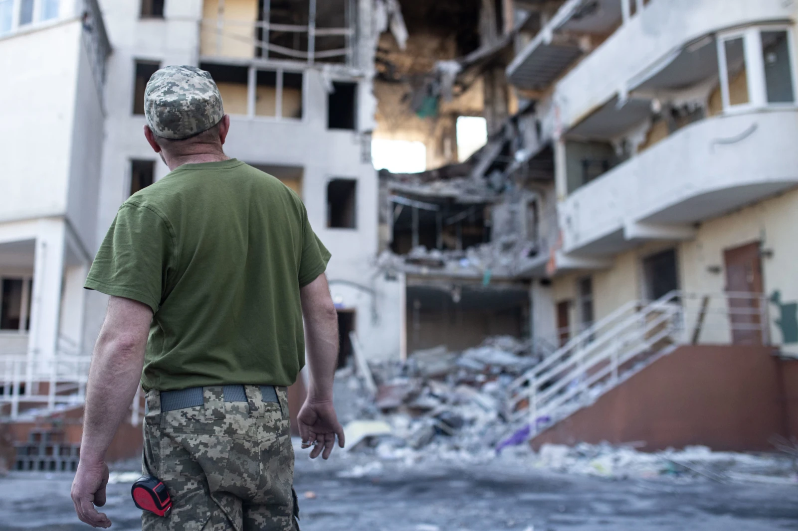 Dans le quartier Tairovo, 4 des 12 étages de l’immeuble ont été détruits par le bombardement. Des pompiers, des volontaires et l’armée participent au déblaiement du bâtiment.