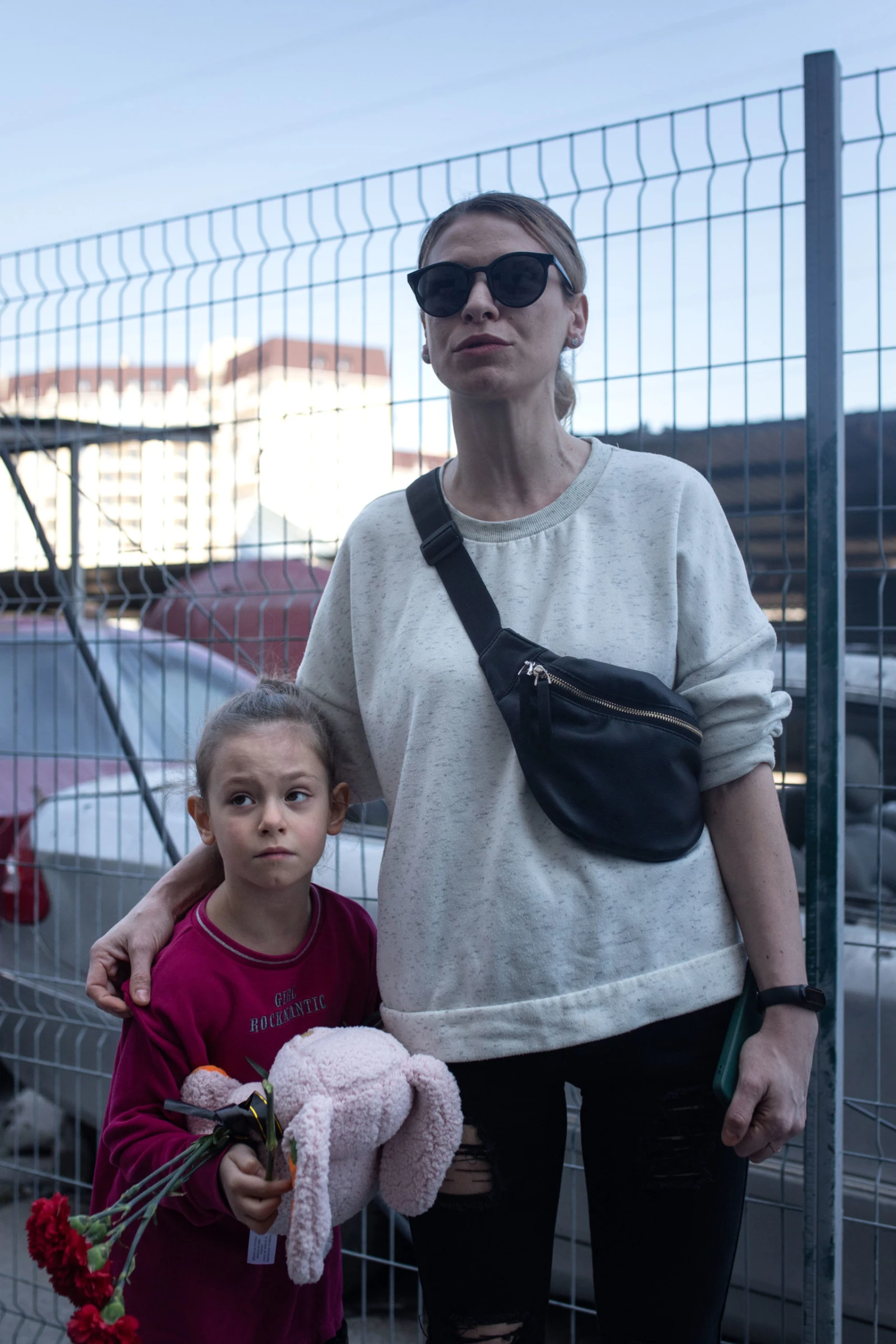 « Ce jour-là, j’ai vu le missile tomber. Ma fille Alissa a 6 ans. On vient déposer des fleurs pour rendre hommage aux victimes. Je voulais voir ça de mes propres yeux, je ne réalise pas encore ce qui s’est passé. Je ne connaissais pas personnellement les gens de l’immeuble, mais je les croisais parfois. Une des victimes était une championne de body-building, elle était enceinte. La Russie ne raconte que des mensonges. Le monde ne comprend pas les horreurs qui arrivent en Ukraine, mais tout cela est vraiment en train d’arriver. »