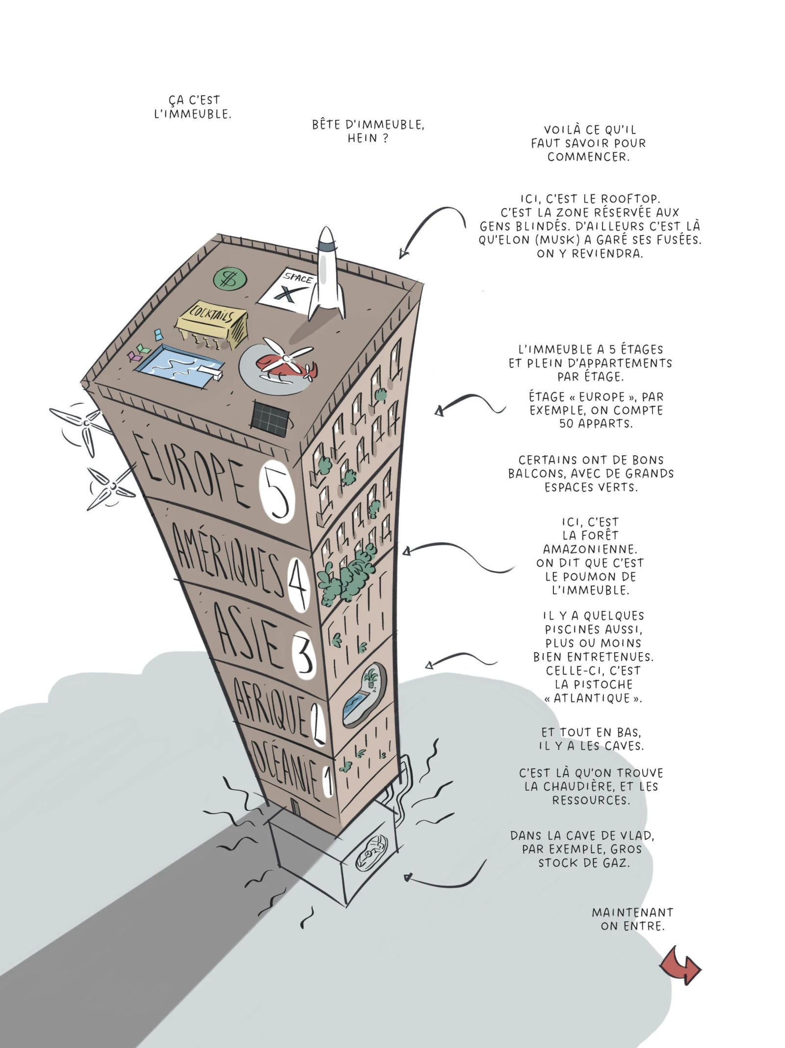 Vous confondez Donald Trump et Javier Milei ? Vous vous demandez pourquoi Poutine et Zelenski ne sont toujours pas rabibochés, franchement ils abusent ? Vous pensez que la géopolitique, c’est le parti des profs d’histoire géo pour la présidentielle 2027 ? Pas de panique, l’illustrateur Mikko et son acolyte le prof Péron ont pensé à vous avec “La guerre des voisins” ! Pour faire comprendre les relations internationales du moment et leurs enjeux, ces génies de la métaphore ont imaginé le monde comme un immeuble, où chaque pays a son appart et chaque continent, son étage. Et comme dans tous les immeubles, il y a des conflits entre voisins, des problèmes avec la chaudière, et un syndic qui fait ce qu’il peut pour gérer ce bordel. Pti aperçu de notre building qui donne des fois envie d’aller de l’autre côté de la rue !