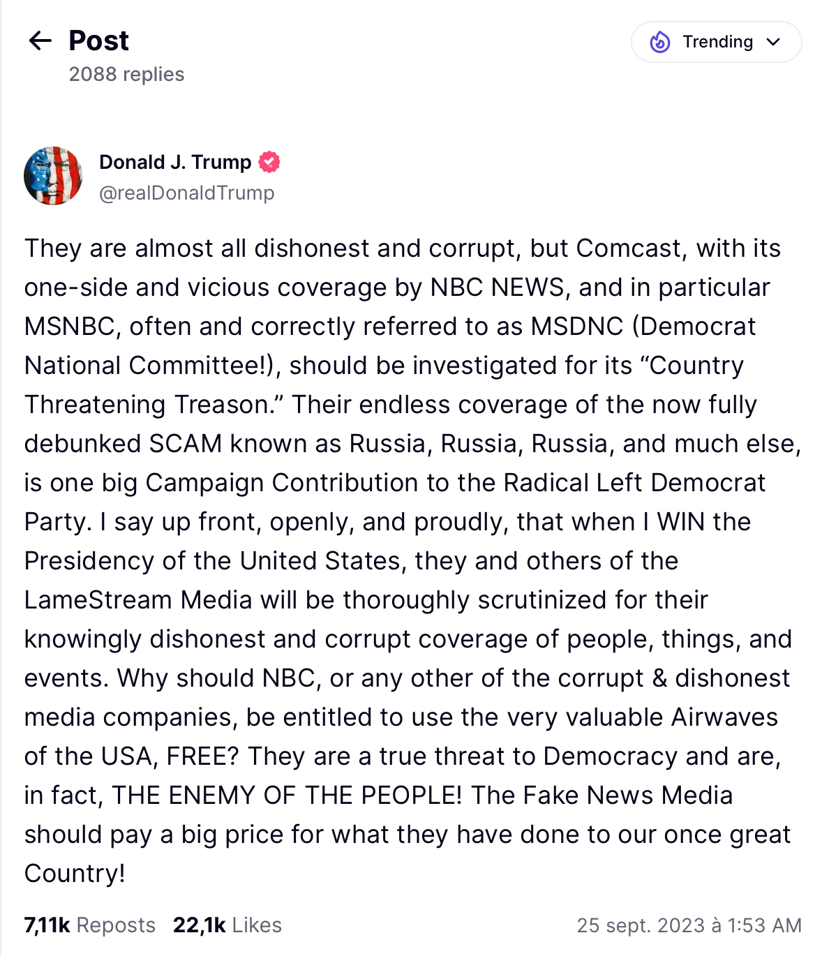 Notez l’ironie de sa dernière phrase : « Les médias de fake news devraient payer une lourde amende pour ce qu’ils ont fait au grand pays qu’étaient les États-Unis autrefois ! »