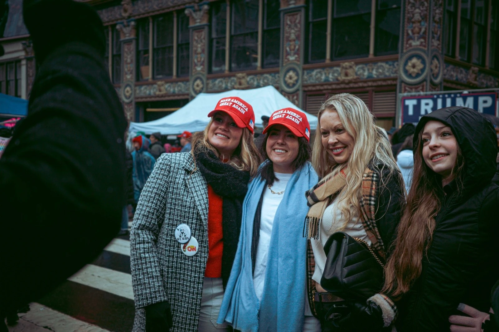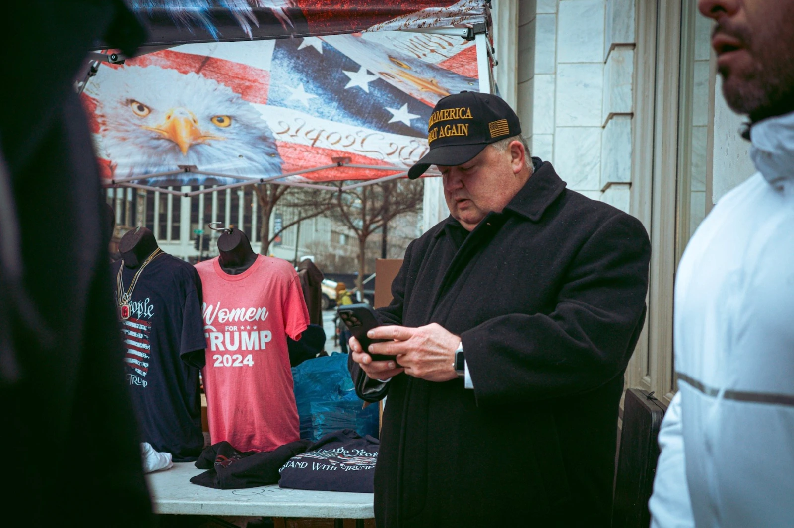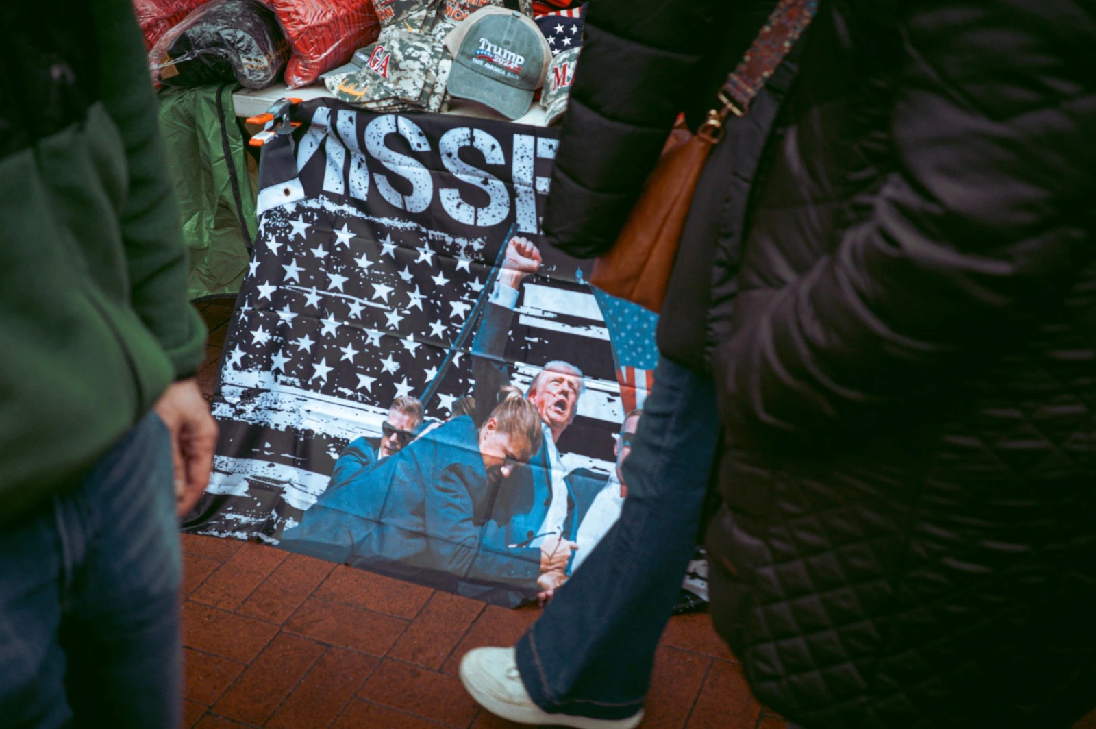 Ce matin, pour rejoindre la zone animée où médias, partisans et vendeurs se croisent dans une ambiance de kermesse, il faut d’abord franchir un checkpoint. Mon sac à dos, jugé trop encombrant, m’oblige à improviser. Je négocie avec un vendeur ambulant pour qu’il le garde. Marché conclu, mais en échange, je me retrouve avec un tote bag en lin trop petit, frappé du logo Trump et payé fucking 30 $ US.