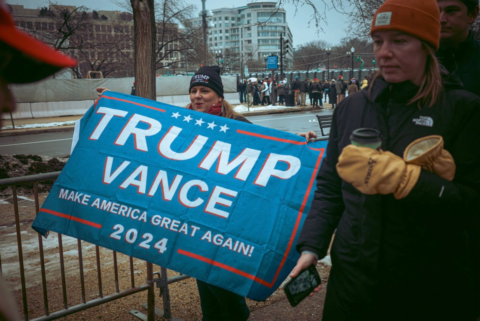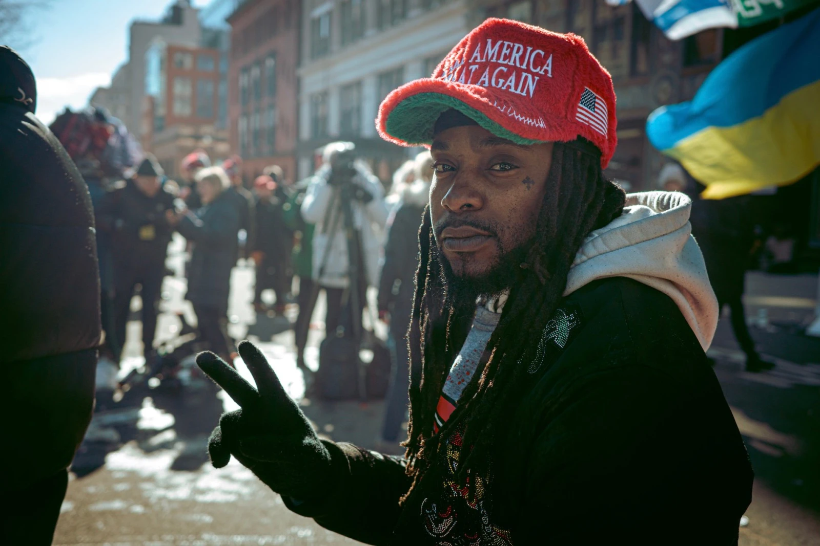 Malgré un soleil généreux, le froid mordant engourdit les mains. Je trouve refuge dans un Starbucks où les employés ont perdu le contrôle depuis longtemps. J’en profite pour regarder la diffusion de l’assermentation sur le iPad d’une femme trans aux cheveux tressés en dreadlocks, elle-même entourée d’un prêtre orthodoxe grec et d’un trio de journalistes camerounais. Un moment suspendu, étrangement beau, au cœur de la tempête.