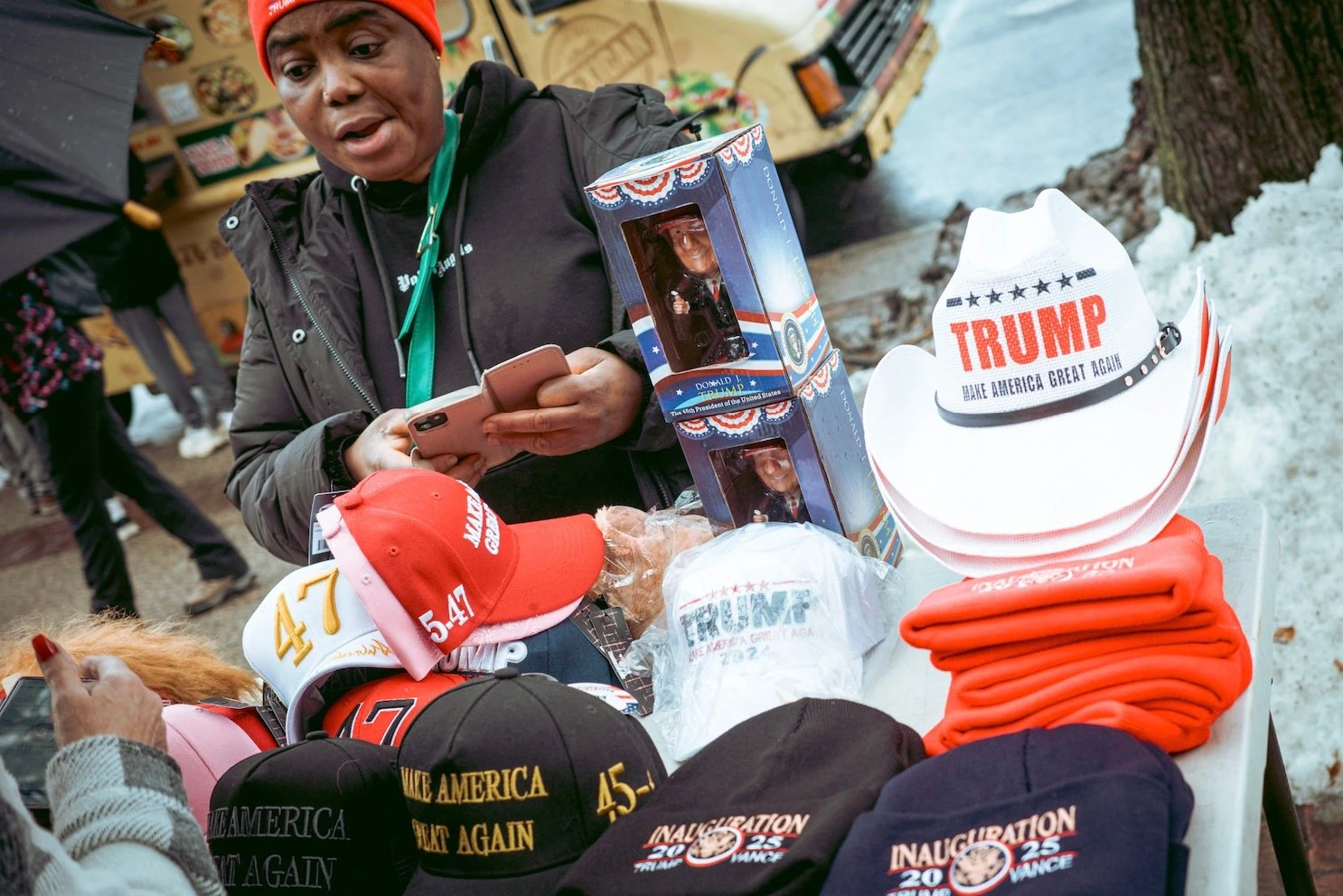 Des couvre-chef en poil, des cravates, des perruques, des ponchos, des réchauffe-mains, des bretzels, chacun a sa combine bien à lui. « Tu trouveras pas ça au Walmart », lance un homme aux bras chargés de hoodies.