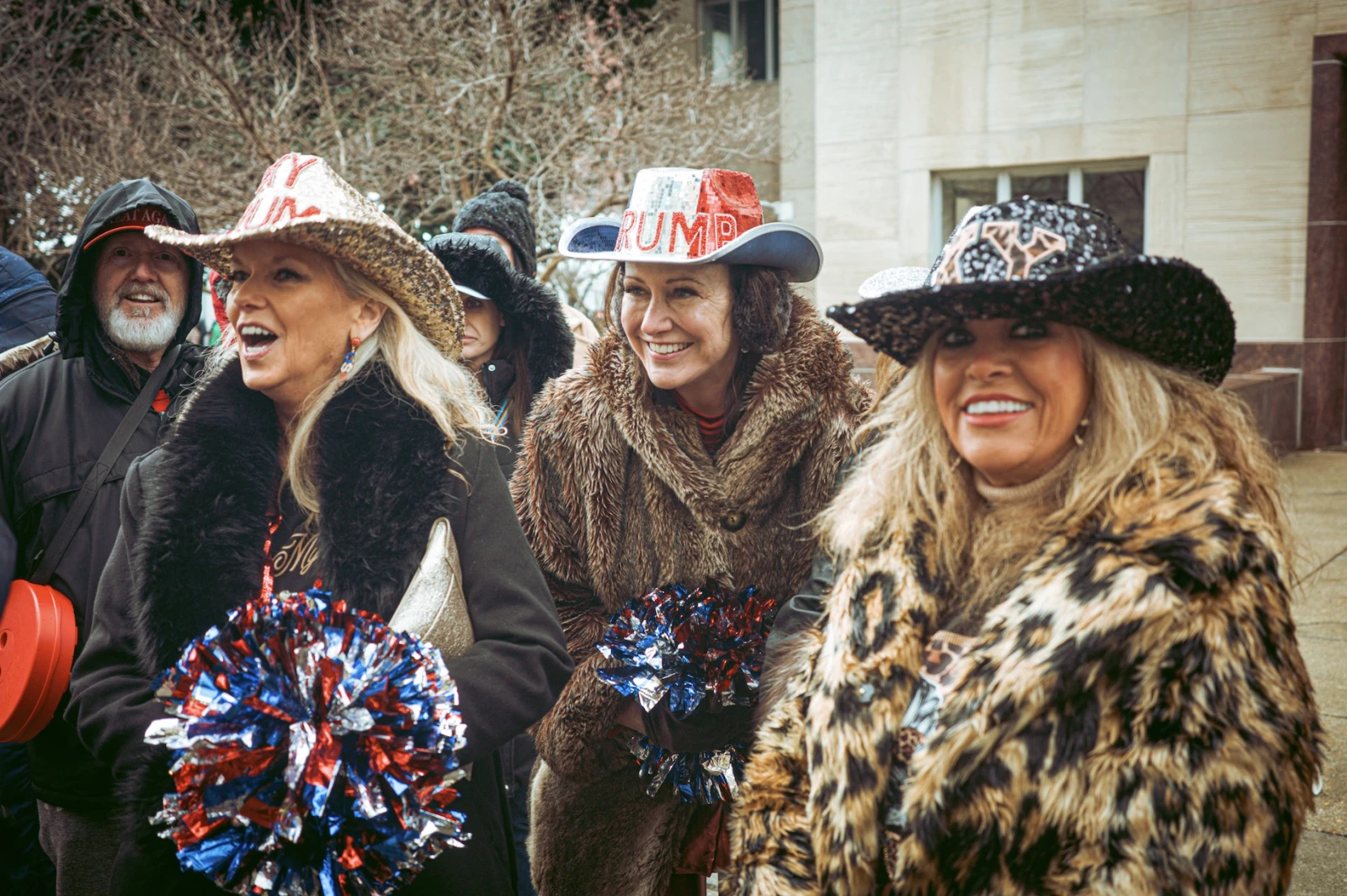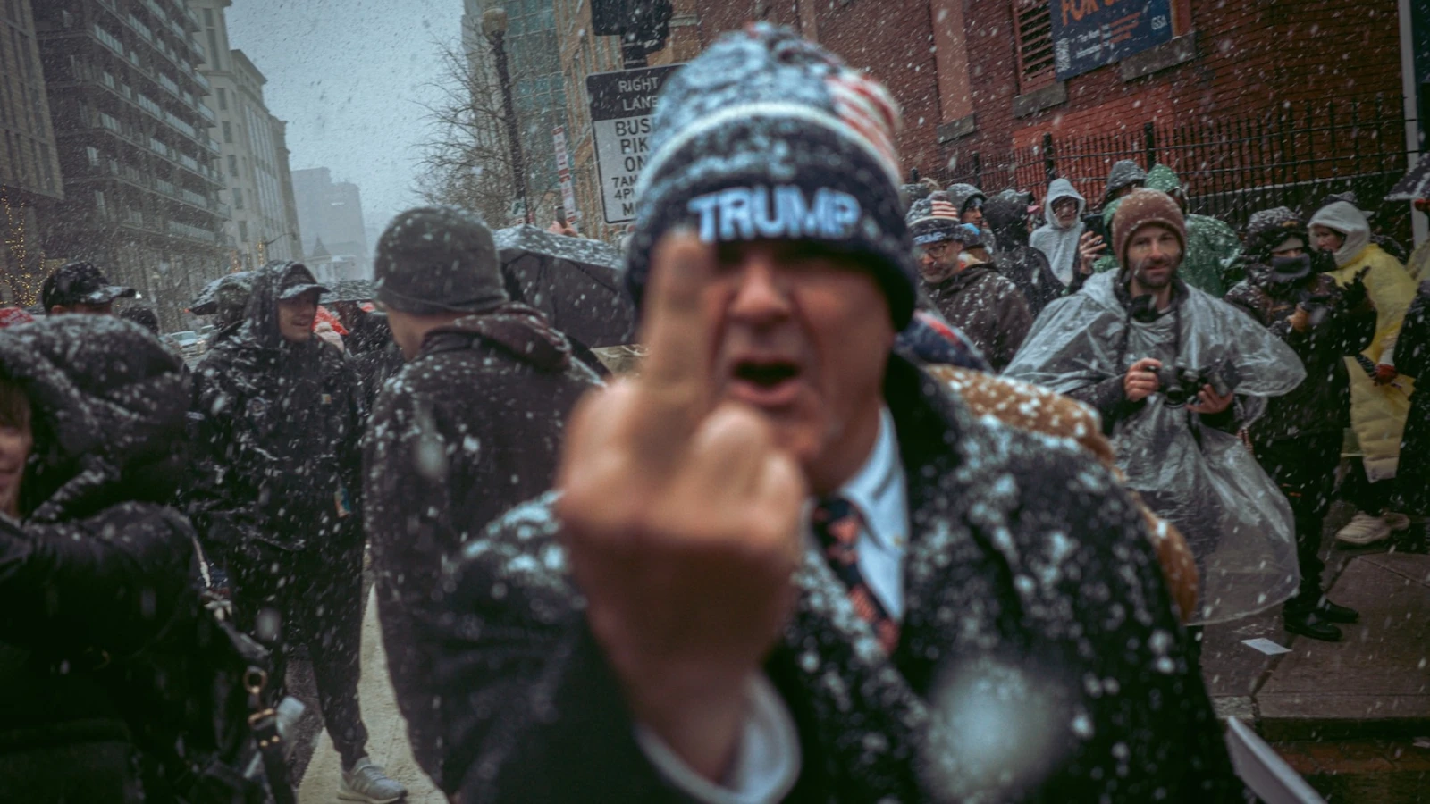 Dans ce long ruban humain sans début ni fin défile toute l’Amérique dans son éclatante diversité. Des Jesus freaks, des vétérans, des finance bros, des fermiers, des SDF, des complotistes et des couples aux allures d’aristocrates. Les bikers en cuir croisent des cowboys, tandis que des meufs surmaquillées s’égarent entre des silhouettes en tenues militaires. Chaque morceau de cette mosaïque populiste se présente comme un acteur triomphant et assumé de la victoire.