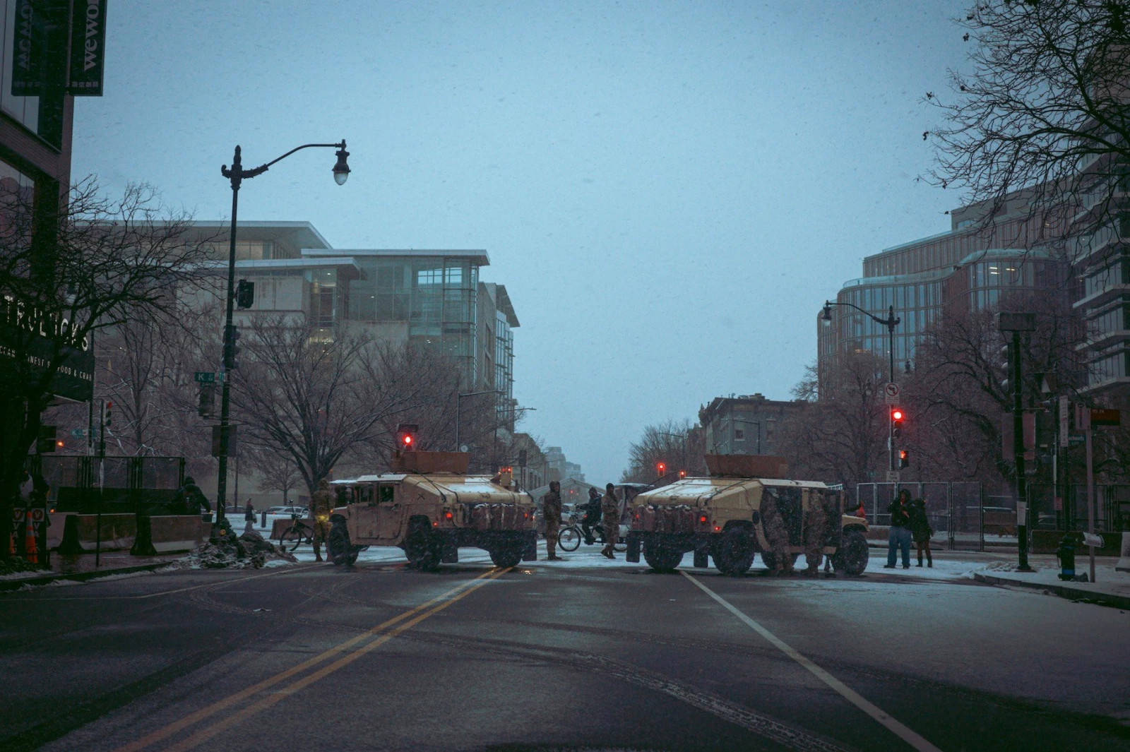 En toile de fond, un concert incessant de sirènes, d’hélicoptères et de Hummers postés à chaque coin de rue. L’ambiance n’est pas à la guerre, mais à une fête étrange, presque joyeuse, malgré une météo capricieuse. La pluie s’invite, puis la grêle, puis la neige, mais rien ne semble atteindre l’enthousiasme des victorieux, enveloppés dans leurs bannières et leurs certitudes dont plusieurs prennent le temps de remercier les militaires pour leur service.