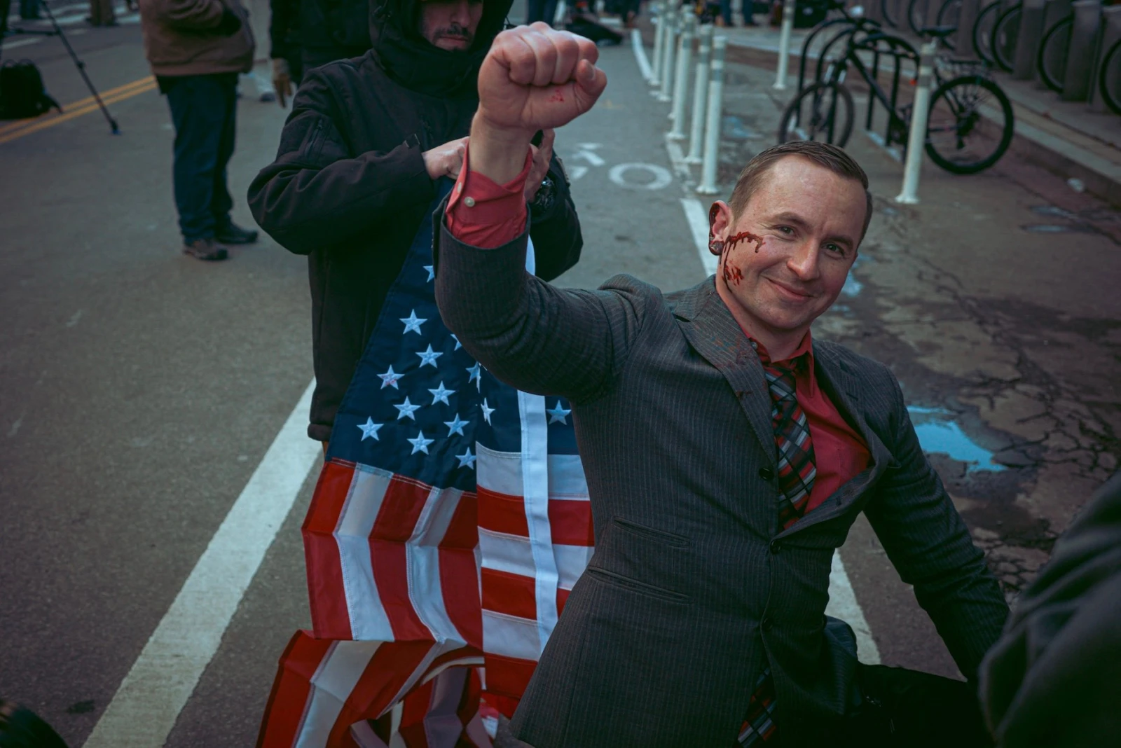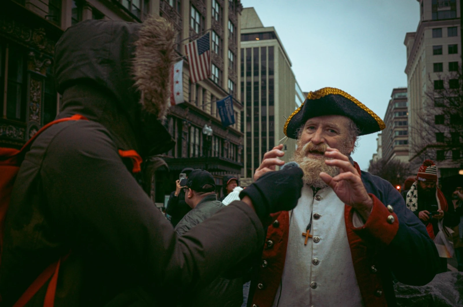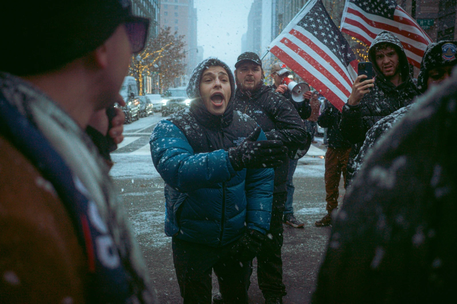 À l’écart, de rares contre-manifestants – marginaux en pyjama ou fervents défenseurs des droits LGBTQ+ – se rassemblent en petits groupes tenaces, loin de vouloir passer inaperçus. Il n’en faut pas plus pour que la milice de Dante, toujours à l’affût, s’approche pour les provoquer. Regards amusés pour certains, inquiets pour d’autres. La tension monte, mais la police intervient rapidement.