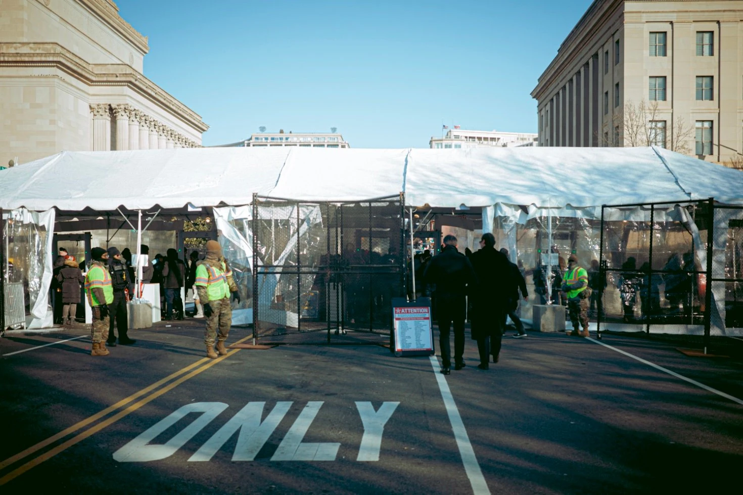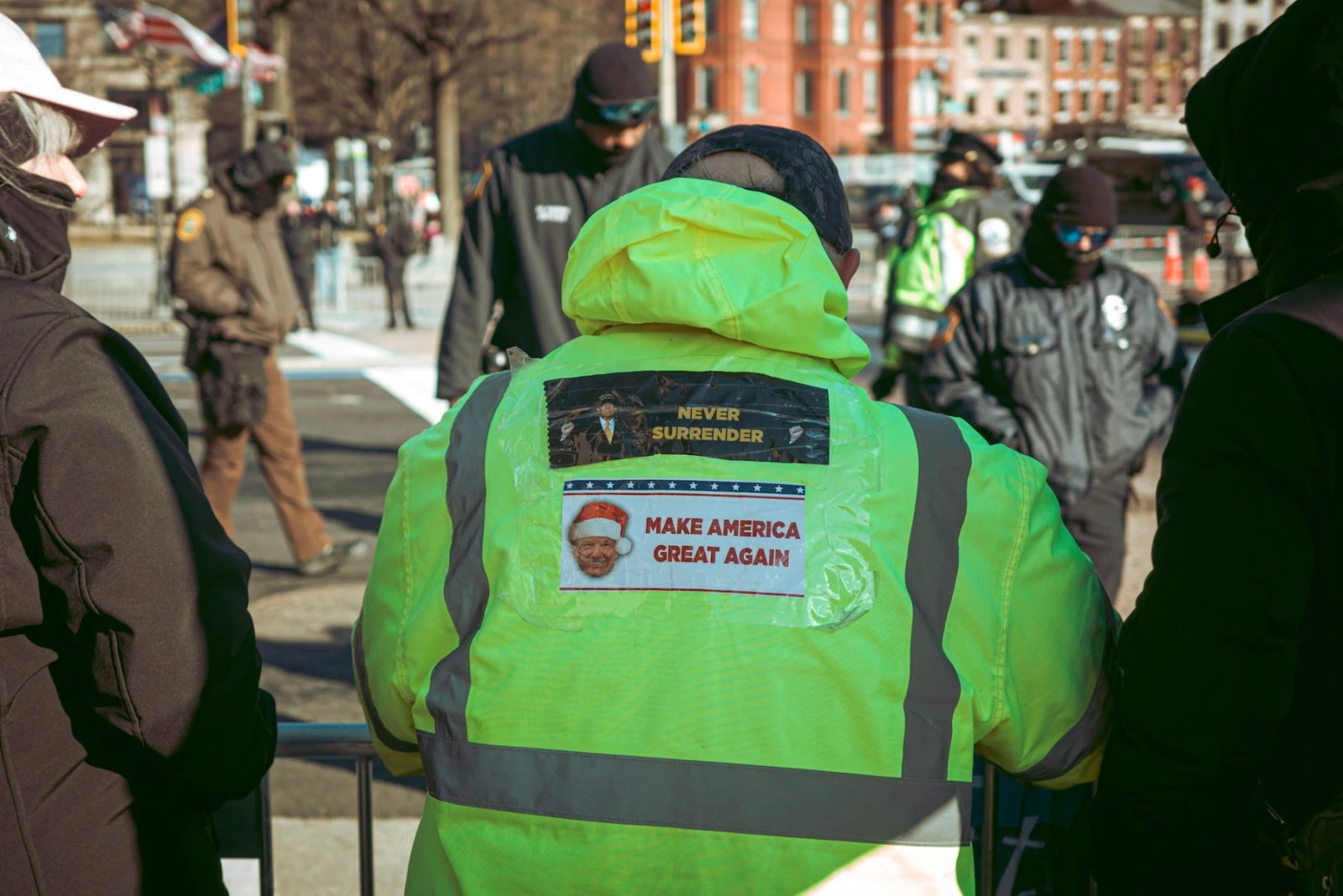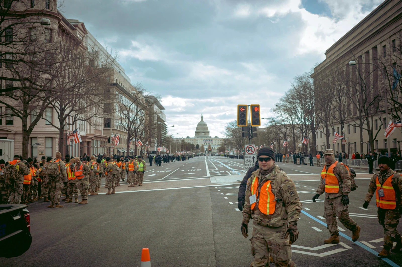 La Pennsylvania Avenue, artère symbolique menant au Capitole, vient d’être bouclée. Pendant près d’une heure, nous restons immobilisés, sous l’œil impassible de centaines de militaires. Parmi la foule, quelques silhouettes en habits de gala s’aventurent à se mêler à la plèbe aux costumes bricolés. L’inconfort est palpable : les plus riches, visiblement vexés, supportent mal d’être coincés avec la masse.