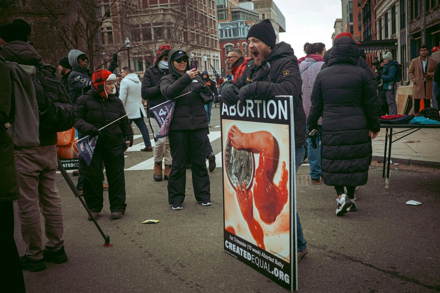 À l’extérieur de l’aréna, la grande messe bat son plein. À l’angle de la 10ᵉ et de G Street, imitateurs, musiciens, médias internationaux, influenceurs, YouTubers et conservateurs de tous horizons se pressent, réunis sous la bannière de cette figure au teint orangé. Entre les pancartes gore contre l’avortement, des couples se trémoussent mollement sur YMCA des Village People, étrangement joyeux sous le poids d’une nouvelle oligarchie réactionnaire.