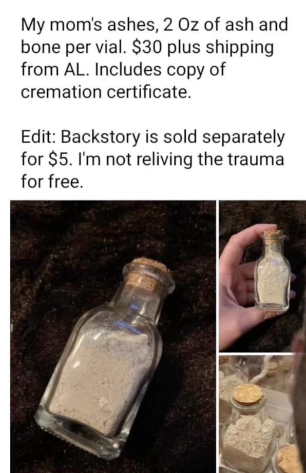 L’annonce proposait 56,7 grammes de cendres et d’os par flacon ainsi qu’une copie du certificat de crémation. Et pour 5$ supplémentaire, le vendeur racontera l’histoire de sa maman car il ne veut pas revivre son traumatisme gratuitement.