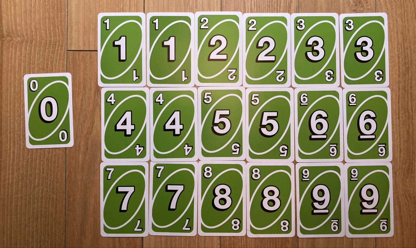 Les cartes numérotées de 1 à 9 se retrouvent deux fois dans chacune des quatre couleurs pour un total de huit exemplaires par nombre. Ainsi, si les cartes avec un gros 6 en dessous sont sorties 7 fois et que vous avez la dernière, vous savez que la seule façon de la jouer sera par sa couleur comme il ne reste plus d’autres 6 en jeu, et donc, que personne d’autre ne pourra en jouer. Sortez le dernier 6 avec la petite barre en dessous de votre main dès que vous le pouvez.
