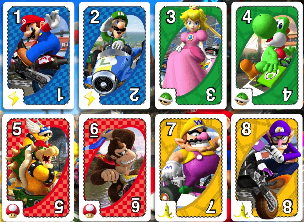 Le hasard joue un très grand rôle dans Uno, mais la providence a décidé que certains ne peuvent pas jouer à la version classique. Si vous jouez avec un daltonien, différencier les couleurs sera une tâche laborieuse. Heureusement, les cartes de la même couleur de l’édition Mario Kart de Uno ont un petit logo différent en bas à gauche :