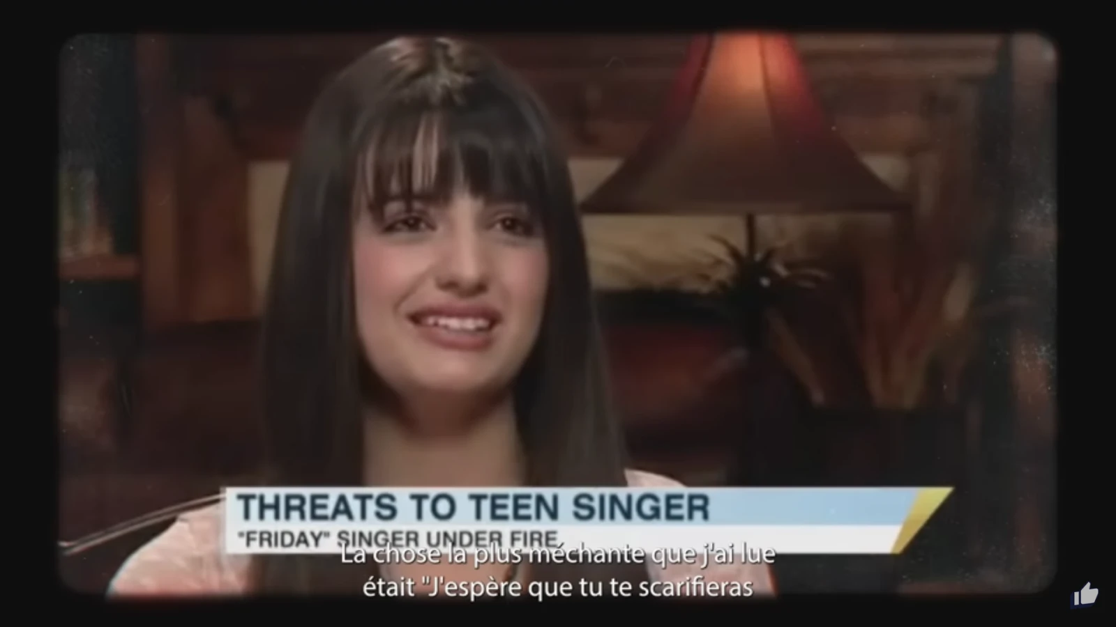 Une californienne de 13 ans qui se dresse, cheveux au vent, dans le cabriolet de ses ami.es, et semble prête à en découdre avec son weekend. Une jeune fille qui voulait juste vivre son rêve et va bientôt devenir la risée des Internets. Avec ses 264 millions de vues et un ratio de 84 % de pouces rouges contre 16 % de pouces verts, le clip de Friday est l’une des vidéos les moins bien notées de la plateforme et la chanteuse en herbe va subir durant de nombreuses années un raz-de-marée de moqueries et un torrent de harcèlement. Menaces de mort par courrier, insultes téléphoniques quotidiennes, violences permanentes au collège : l’adolescente va tomber dans une profonde dépression et sera contrainte de suivre une partie de sa scolarité à la maison.