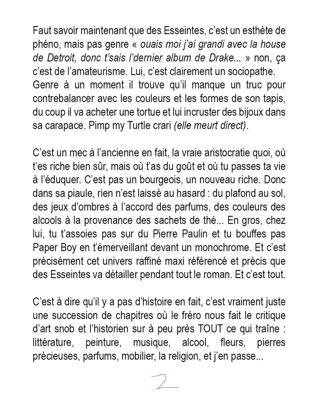 Non, mais c’est un débat vieux comme le monde en vrai, tout ce truc autour de la culture, qu’il y en a des supérieures et des plus importantes, bla-bla-bla. Moi je suis pas d’accord. Tu peux être la personne la plus cultivée du monde et être une grosse merde humainement. Puis être cultivé ça veut rien dire déjà. Dans la vie réelle on s’en branle, je pense pas qu’il faut aborder l’art sous le prisme de l’envie de se cultiver, sinon tu vas finir par faire des TikTok de prouveur là, qui font des routines réveil à 4h, musculation, lecture, douche froide, boulot, dodo. L’art dans son ensemble c’est aussi et surtout à envisager comme un loisir, pas seulement comme un moyen d’élévation sociale. En tout cas, c’est mon avis. À la fin, je préfère 1.000 fois parler à un quelqu’un qui a lu des romans de gare parce qu’il en avait envie qu’un type qui se branle sur moi parce qu’il a lu Proust juste parce que « faut le lire pour être quelqu’un d’intelligent il paraît ».