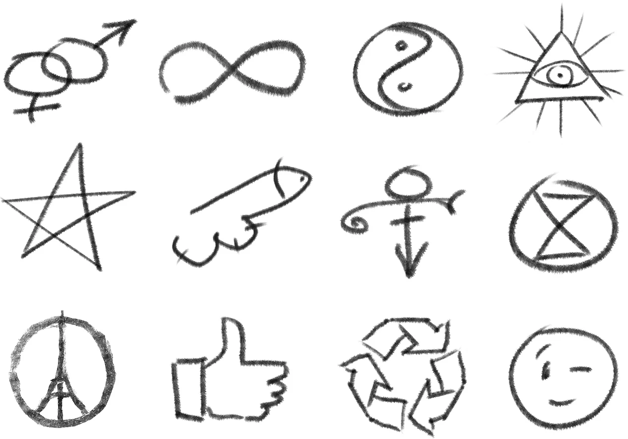 Plusieurs autres signes peuvent être vus comme des prétendants au titre de symboles universels. Les symboles des genres (joyeusement modulables), l’infini (mathématique et philosophique), le yin/yang (pour les amateurs d’équilibre), l’Œil de la Providence (et son pendant complotiste Illuminati), l’étoile (qui veut dire BEAUCOUP de choses), le pénis (parfois ailé), Lovesymbol (a.k.a. Prince), l’extinction (et Extinction Rebellion), Peace for Paris (pour les attentats de Paris, en 2015), le pouce en l’air (merci Facebook), le logo du recyclage (pas facile à dessiner), les émojis…