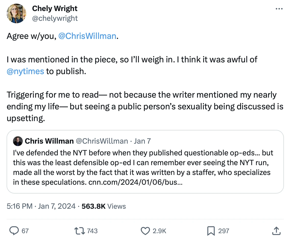 L’équipe de la chanteuse offrira d’ailleurs une réponse cinglante 48h plus tard, communiquant à CNN avoir trouvé l’article « envahissant, faux et inapproprié ». La chanteuse américaine Chely Wright, citée dans l’article comme un exemple de rédemption après des années dans le placard, déclarera elle aussi l’essai « horrible » et la discussion publique autour de l’orientation de Taylor Swift « affligeante ».
