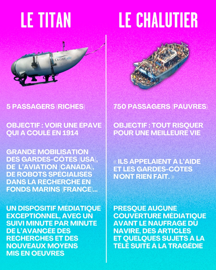 Et depuis qu’il a été porté disparu dimanche dernier, d’importants moyens ont été mis en oeuvre par la France, le Canada et les Etats-Unis pour retrouver le Titan. Un dispositif conséquent, réactif et international : tout ce qui n’a pas été mis en oeuvre le 13 juin dernier lorsqu’un navire rempli de réfugiés a fait naufrage au large de la Grèce.