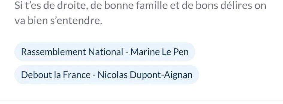 La petite nouveauté avec Droite au coeur, c’est que la plateforme prétend jouer sur le même terrain que les mastodontes du domaine comme Bumble et Tinder, en offrant une version gratuite, géolocalisée (bientôt disponible sous la forme d’une appli) et des filtres de recherches très précis comme le nom du parti sous lequel vous êtes encarté.e. Pour profiter au max de toutes ses fonctionnalités et être bien certain.e de trouver la perle rare qui vous fera lever le drapeau tous les matins, vous êtes donc très vite invité.e à renseigner votre couleur politique. Et sans surprise, les options sont limitées. Entre la droite ferme et identitaire d’Eric Ciotti, et la droite ferme et identitaire d’Eric Zemmour, le choix de la rédaction s’est porté par défaut sur le premier. Un peu comme les Républicains quand ils ont dû se résoudre à l’élire à la tête du parti…