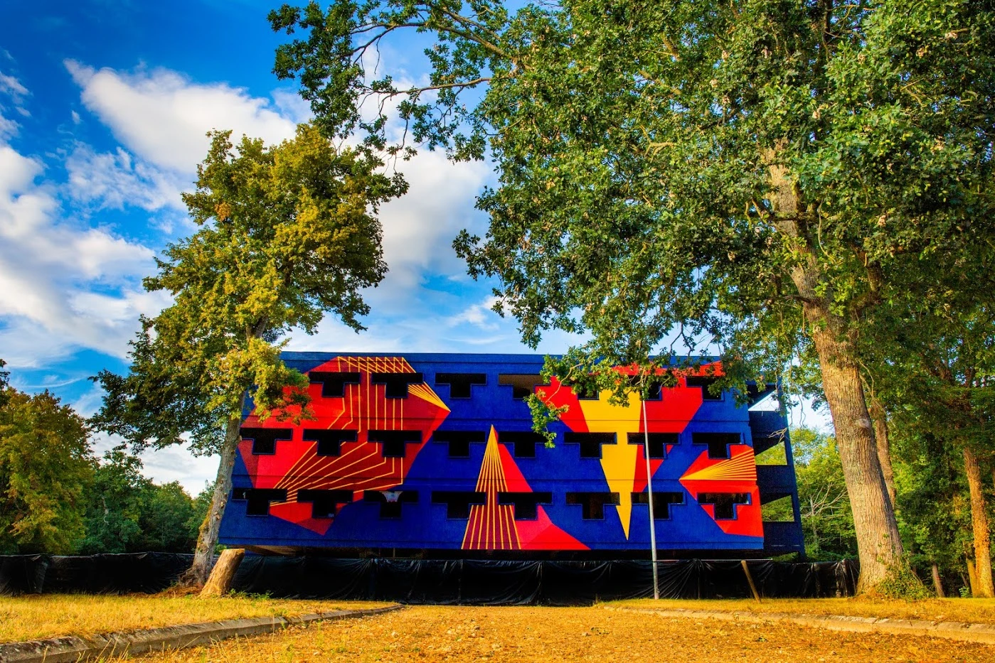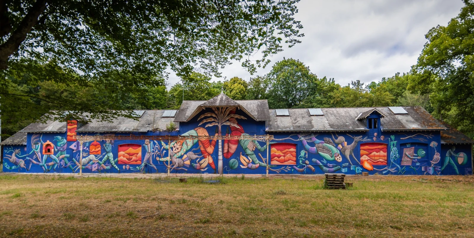 Unies par ce fil rouge, l’ensemble des œuvres se répondent et une grande majorité dialogue avec la nature, omniprésente dans cet écrin boisé. Si le festival qui se tient les 28 et 29 août avec une affiche musicale hautement rappeuse (Arsenik, Neg’Marrons, Nemir…), du live painting et des battles de graffiti, les fresques et installations seront visibles pendant un an, dont la chapelle transformée en boule à facette par Le Diamantaire et les murs des dortoirs pimpés par Sherio, Katre, Seth One ou encore Mondé.