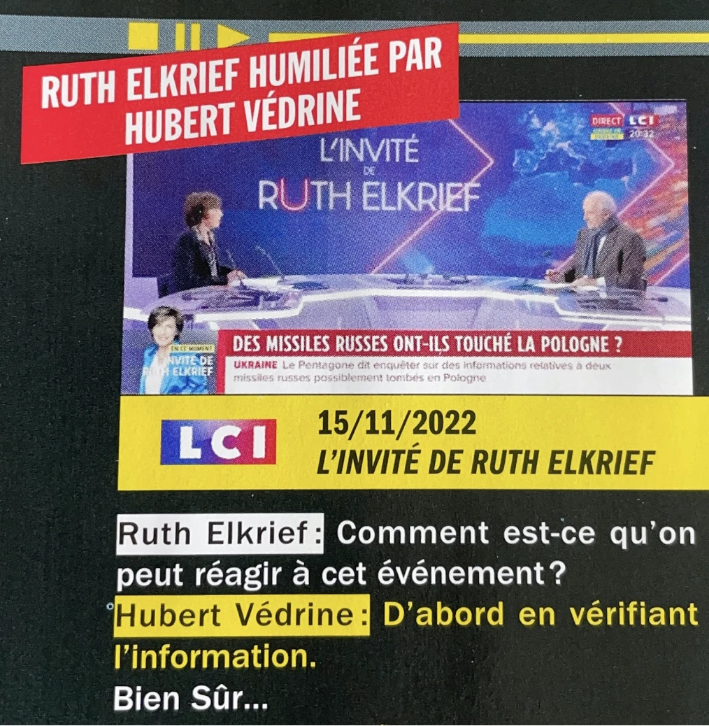 Tout démarre avec un zapping papier (sûrement réalisé pour les gens qui n’ont ni télévision, ni ordinateur, ni smartphone) avec des titres racoleurs comme “Ruth Elkrief humiliée par Hubert Védrine” dont voici un extrait :
