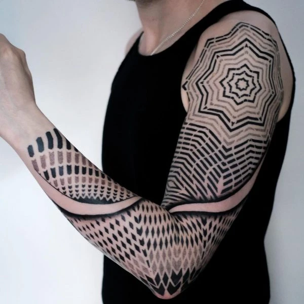Ça en jette sur le papier, ça a l’air de filer droit et d’être sans fioriture, mais ça tourne vite en rond. Le genre de motifs impersonnels, et faciles à reproduire à la chaîne, pour peu qu’on sache se servir d’un dermographe et d’un double décimètre. Très à la mode à l’heure actuelle, en particulier chez les jeunes, leur vide abyssal finira tôt ou tard par sauter aux yeux de tout le monde. Mais bon, au pire, “on aura essayé pour voir”. A ceci près que les faire définitivement disparaître risque de faire bien plus mal que le tatouage en lui-même…