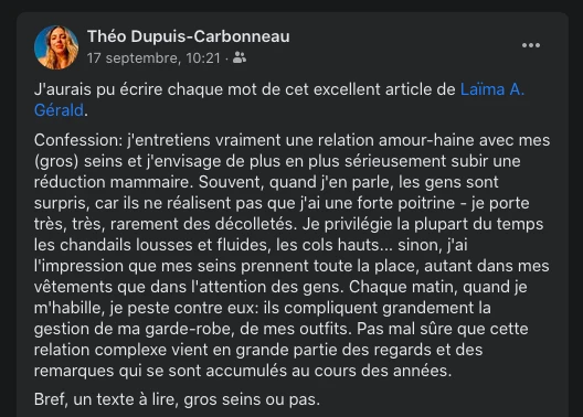 Autre chose: en commentaire (sous la publication Facebook d’URBANIA, sous la publication sur mon compte perso ainsi que sous celle de Théo Dupuis-Carbonneau) j’ai été surprise de constater le nombre élevé de femmes entre 25 ans et 35 ans qui envisagent de se faire faire une réduction mammaire, ou qui l’ont déjà fait.