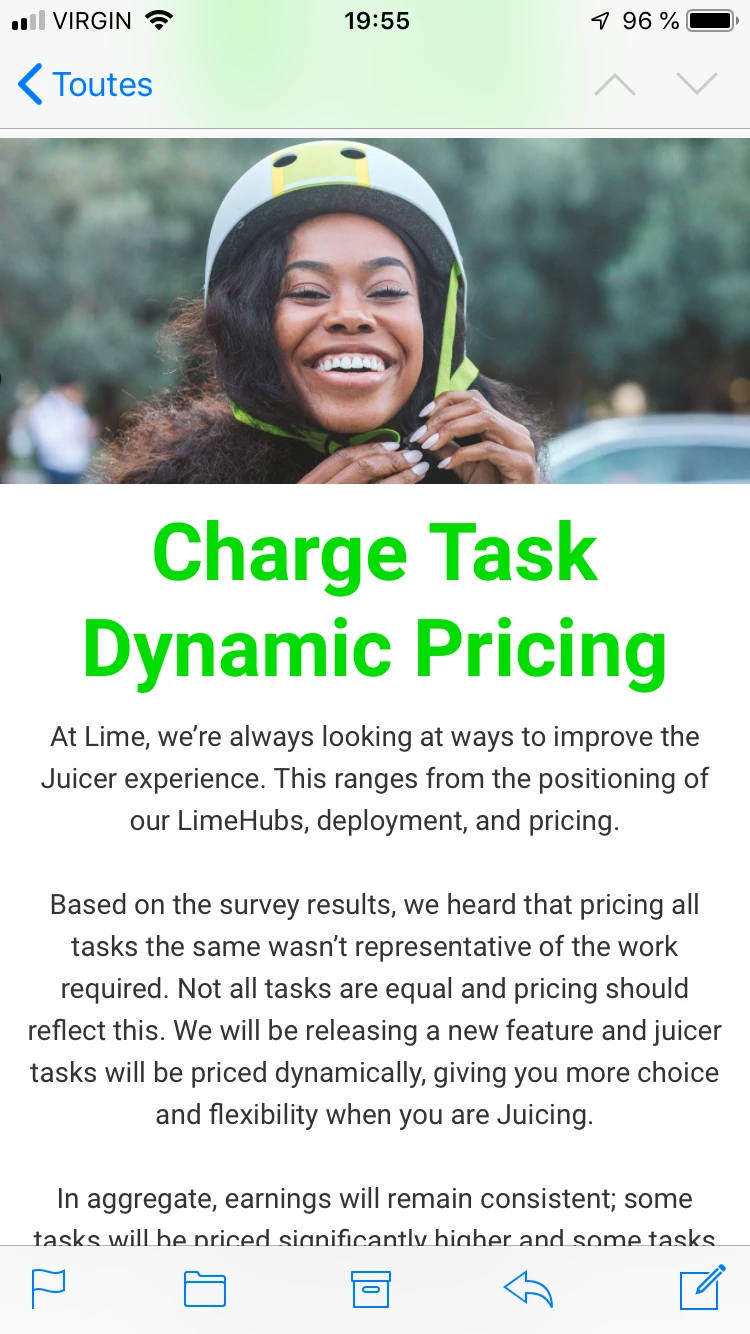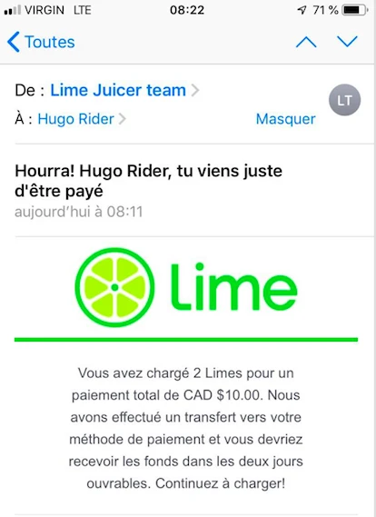 Un dernier petit coup avant d’accrocher mes chargeurs. Dommage, mon salaire à la pièce vient tout juste d’augmenter, oscillant maintenant entre 4,30 à 6,30$ environ, des prix visant à refléter les efforts investis, justifie Lime via un courriel interne.