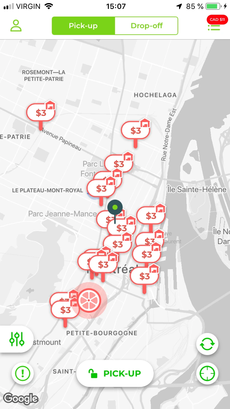 Mais la job ne s’arrête pas là, puisqu’il faut ramener les trottinettes dans une des aires de stationnement consacrées, qui apparaissent sur l’application. Importante contrainte : les trottinettes doivent être en place avant 7h du matin. Oui oui, de belles heures de merde. J’ai donc mis mon cadran à 5h dans l’espoir d’être le Juicer du mois. Malgré quelques nouveaux jurons lancés en essayant à nouveau de faire fitter mes trottinettes dans la valise de ma Matrix, ma première run du matin s’est déroulée comme un charme.