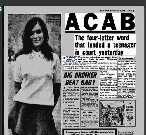À la fin des années 60, toujours en Grande-Bretagne, l’expression s’invite dans le milieu du rock et auprès des punks. En 1967, David Bowie reprend le slogan à sa manière en chantant « All coppers are nanas » à plusieurs reprises dans le titre Over The Wall We Go. En mai 1970, un jeune de 17 ans est arrêté pour avoir porté une veste en jean où il a cousu les lettres ACAB. Emmené au tribunal, l’adolescent dira auprès des juges qu’il s’est inspiré des Hell’s Angels, pensant que l’acronyme signifiait « All Canadians are bums ». L’affaire fera alors les gros titres du Daily Mirror avec un gros « ACAB » affiché dans le journal.