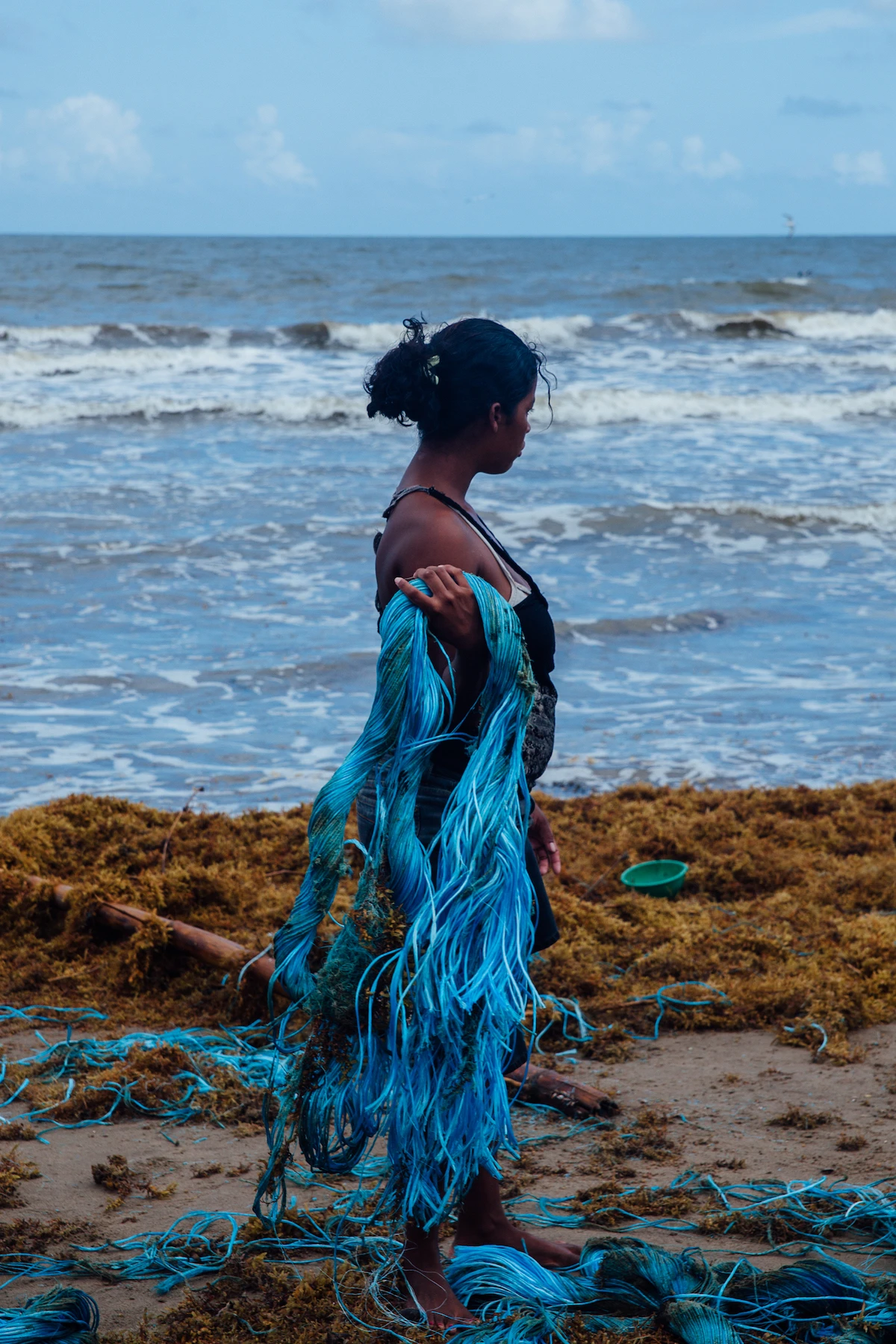 J’étais sur la plage de la lagune une après-midi et j’observais les Miskitos (nation autochtone de la jungle du Honduras) récupérer des déchets venus de la mer. Abandonnés par les bateaux, ils sont ramenés sur le rivage par le vent. Ils les utilisent ensuite pour des travaux dans leur village ou pour faire des aménagements chez eux. La trouvaille du jour ? C’était ces immenses cordages bleus. La scène m’a alors immédiatement frappé. Le regard au loin de cette femme, les couleurs : le bleu du ciel, le bleu de l’eau, le bleu de ces longs fils… J’ai directement immortalisé le moment.