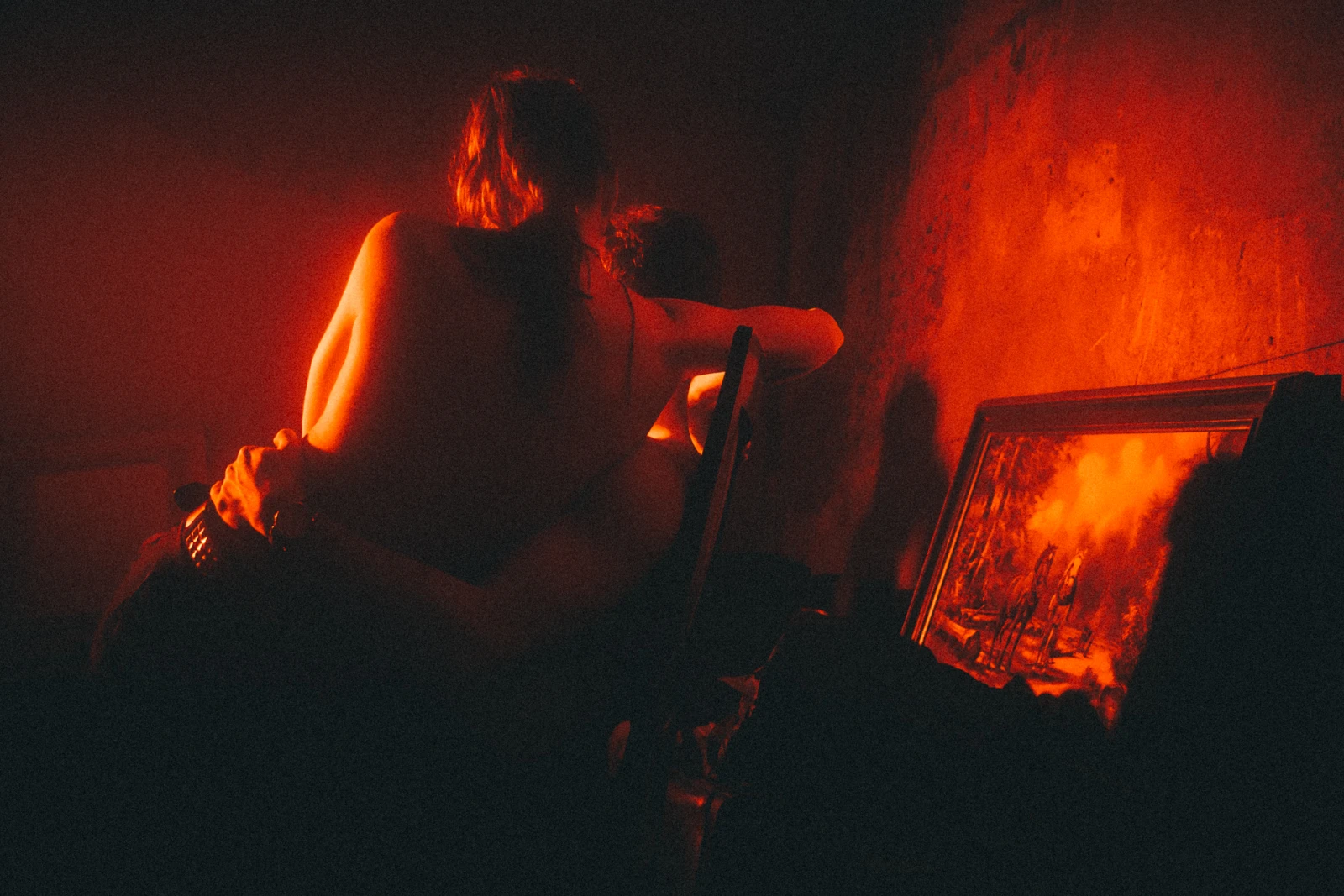 J’ai choisi cette photo parce qu’elle représente bien mon univers – une partie tout du moins – la nuit parisienne. Tout d’abord par sa couleur rouge très présente dans mes clichés et que j’affectionne particulièrement, teinte chaude aux symboliques de passion, de luxure et d’interdit. Aussi car elle met en scène ce couple en partie dénudé, dont la peau rendue visible permet à la lumière de se refléter. Ce sont souvent ces contours de corps et bouts de silhouettes qui se démarquent de ces ambiances sombres où la lumière est difficile à saisir. Captés de dos, on préserve leur anonymat dans des soirées où l’on vient parfois pour se lâcher. C’est vrai que mes photos présentent plus souvent des danseurs en action mais j’aime aussi m’arrêter sur d’autres détails et scènes qui me touchent. Et enfin pour la façon dont on lit cette image, en suivant la direction de la lumière et terminant sur cette peinture posée là, élément improbable de décor de soirée, cadre dans le cadre.