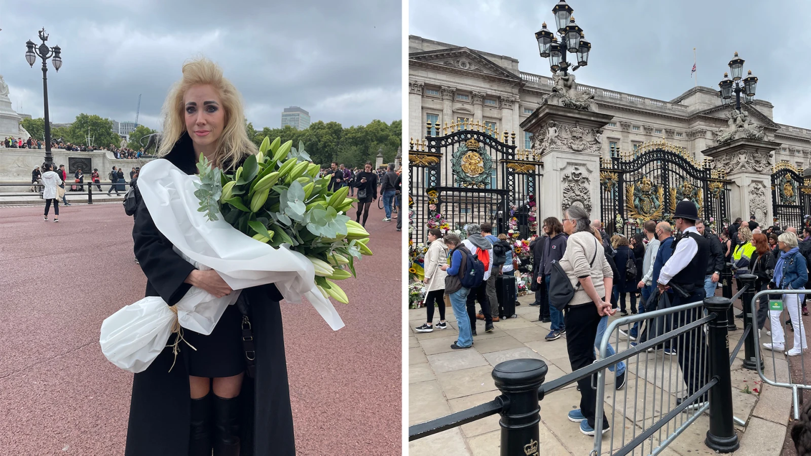 Au lendemain du décès de la monarque, des citoyen.ne.s en deuil se recueillent devant le palais de Buckingham.