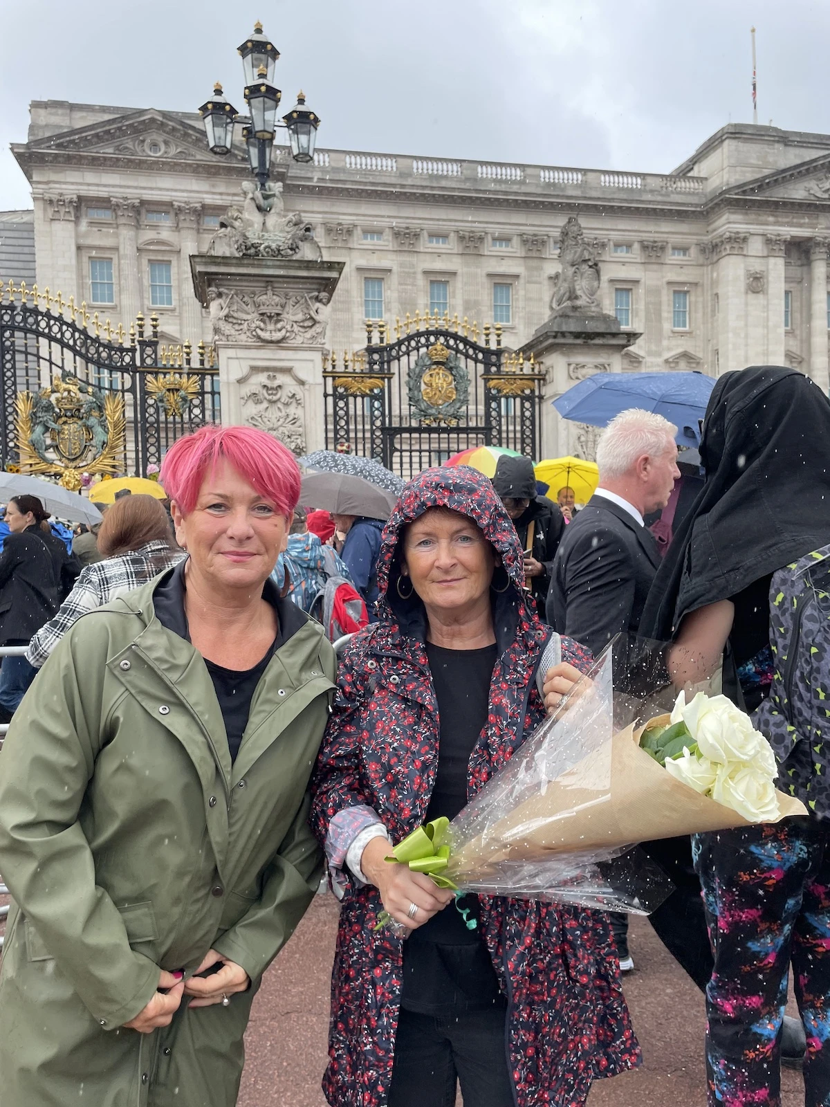 Sue et Stephany, deux Britanniques, enfilent rapidement leurs imperméables lorsqu’une averse inattendue survient. « C’était une reine travaillante. Et je ne suis pas enthousiasmée par Charles », tranche Sue, qui trouve que sa Majesté Charles III a de bien grands souliers à chausser.