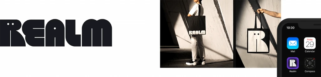 Realm est un producteur américain de podcasts et de livres audio de fiction, du « cinéma pour vos oreilles », d’où le recours à Ruby, la mascotte rigolote qui tient le rôle du R et qui définit le reste du logo. Realm illustre aussi le retour en force des polices des années 70 qui soufflent un vent de fraîcheur sur le monde souvent aride de la typographie. C’est une création de Mother Design, de New York.