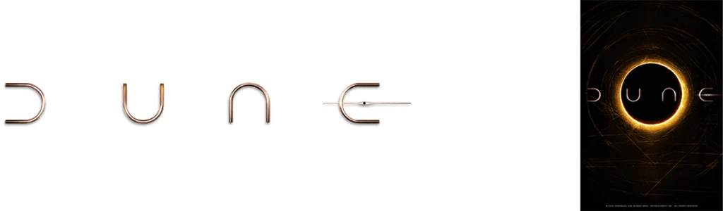 Le dévoilement du logo du film Dune, en avril, était un événement en soi. Rien ne vaut un design minimaliste pour illustrer une saga intersidérale. C’est donc la répétition d’une forme pure qui dessine les quatre lettres de DUNE. Un coup de chance, car rares sont les titres qui offrent cette possibilité. Notons que dans la toute première version, les graphistes avaient négligé d’ajouter l’élément horizontal dans le E, ce qui avait fait dire aux fans les plus susceptibles que le film s’appellerait DUNC. Duh.