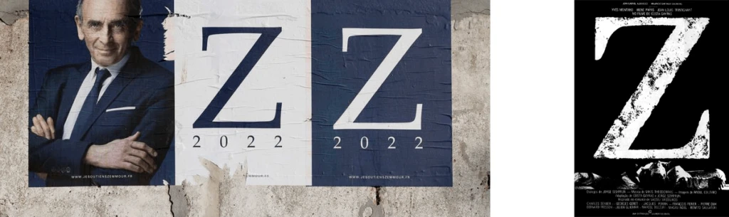 Est-ce bon ou mauvais ? Est-ce même un logo ? Candidat controversé à la présidence de la République française, Éric Zemmour apparaît sur ses affiches à côté d’un grand Z qui attire l’attention. Z comme Zorro ? Comme la dernière lettre de l’alphabet ? Comme zzzzzzz, le sommeil ou la mouche du coche ? Personnellement, ça m’évoque surtout Z, de Costa Gavras, un beau film de Noël qui parle de corruption politique !