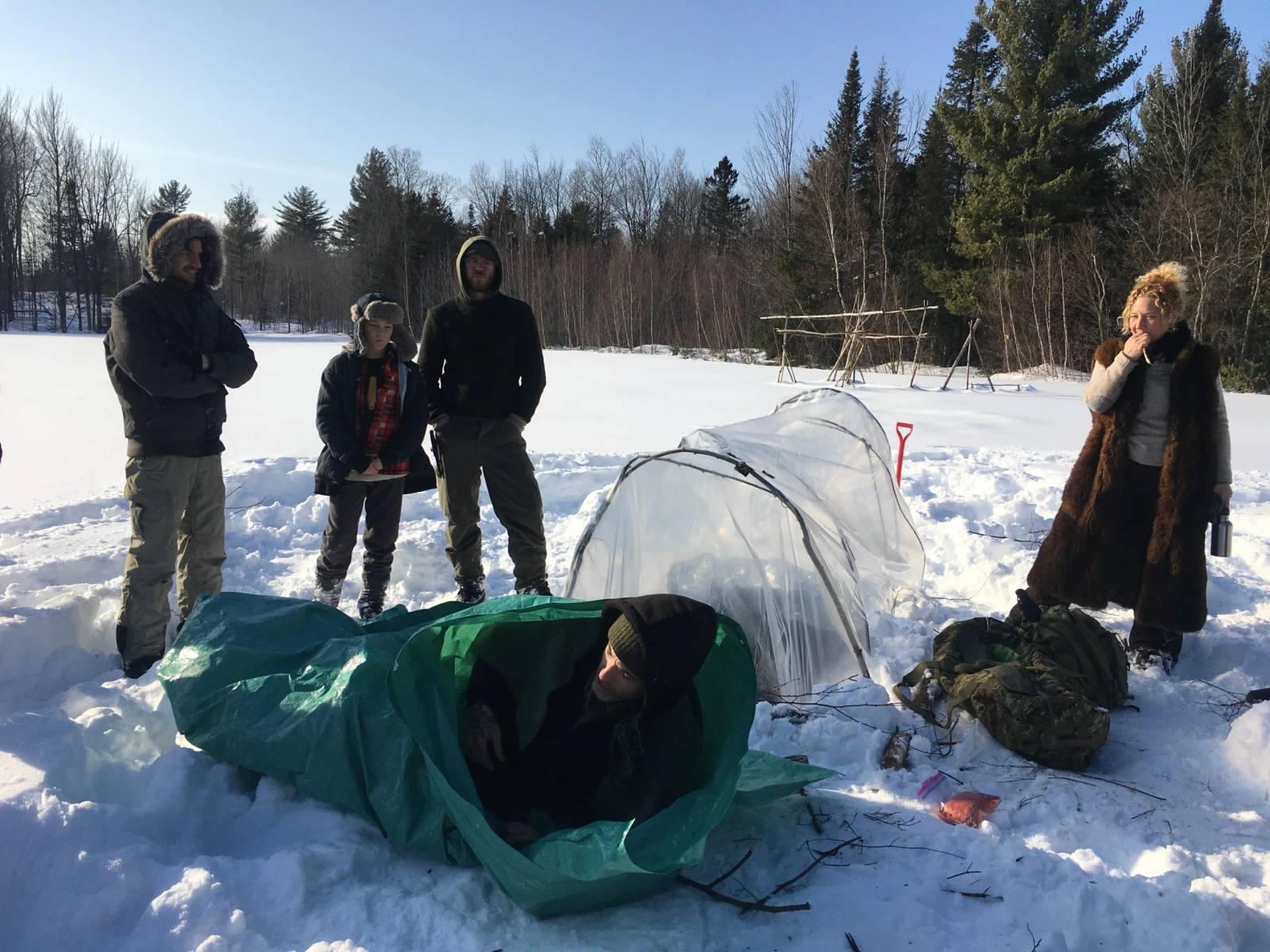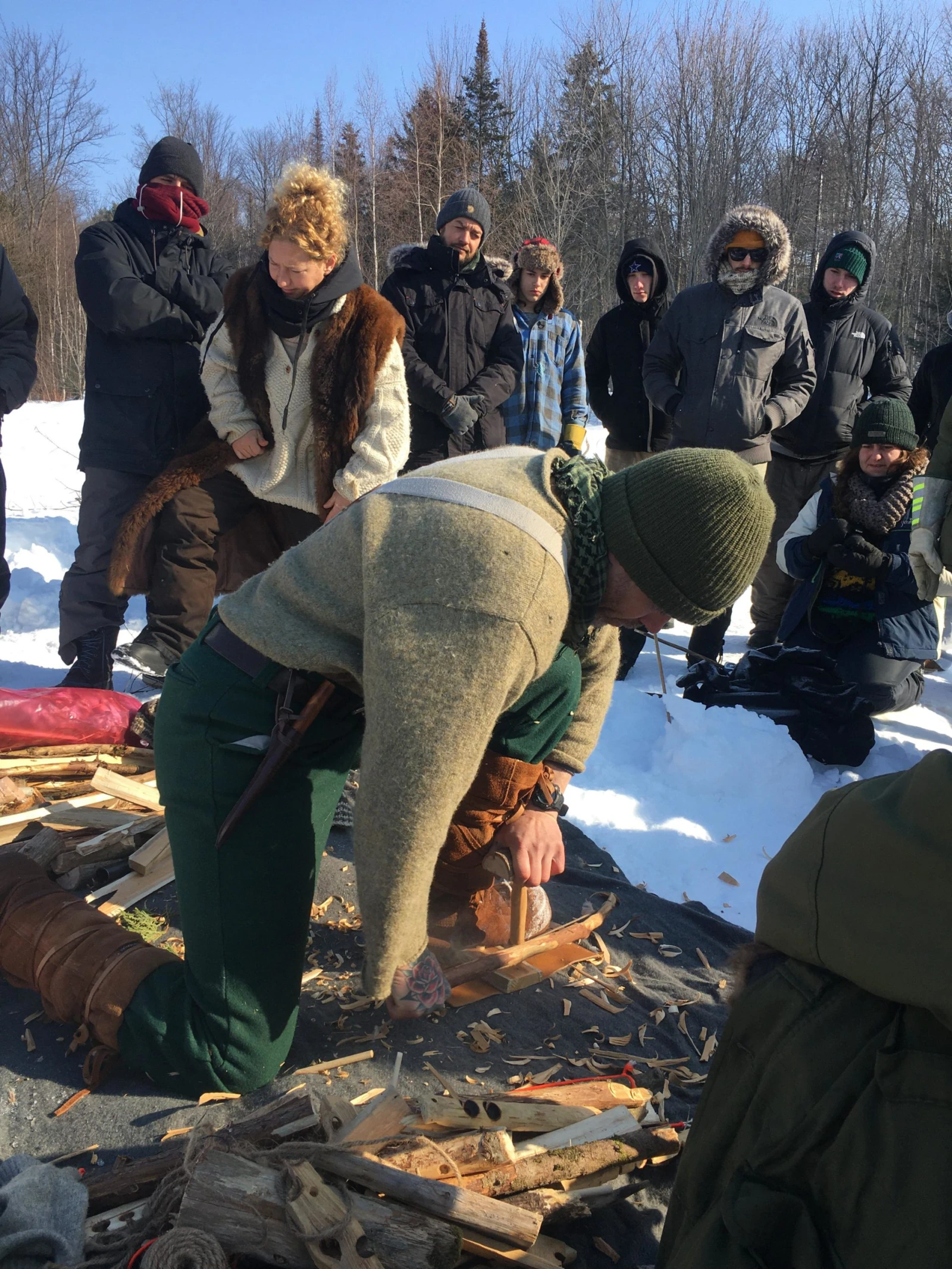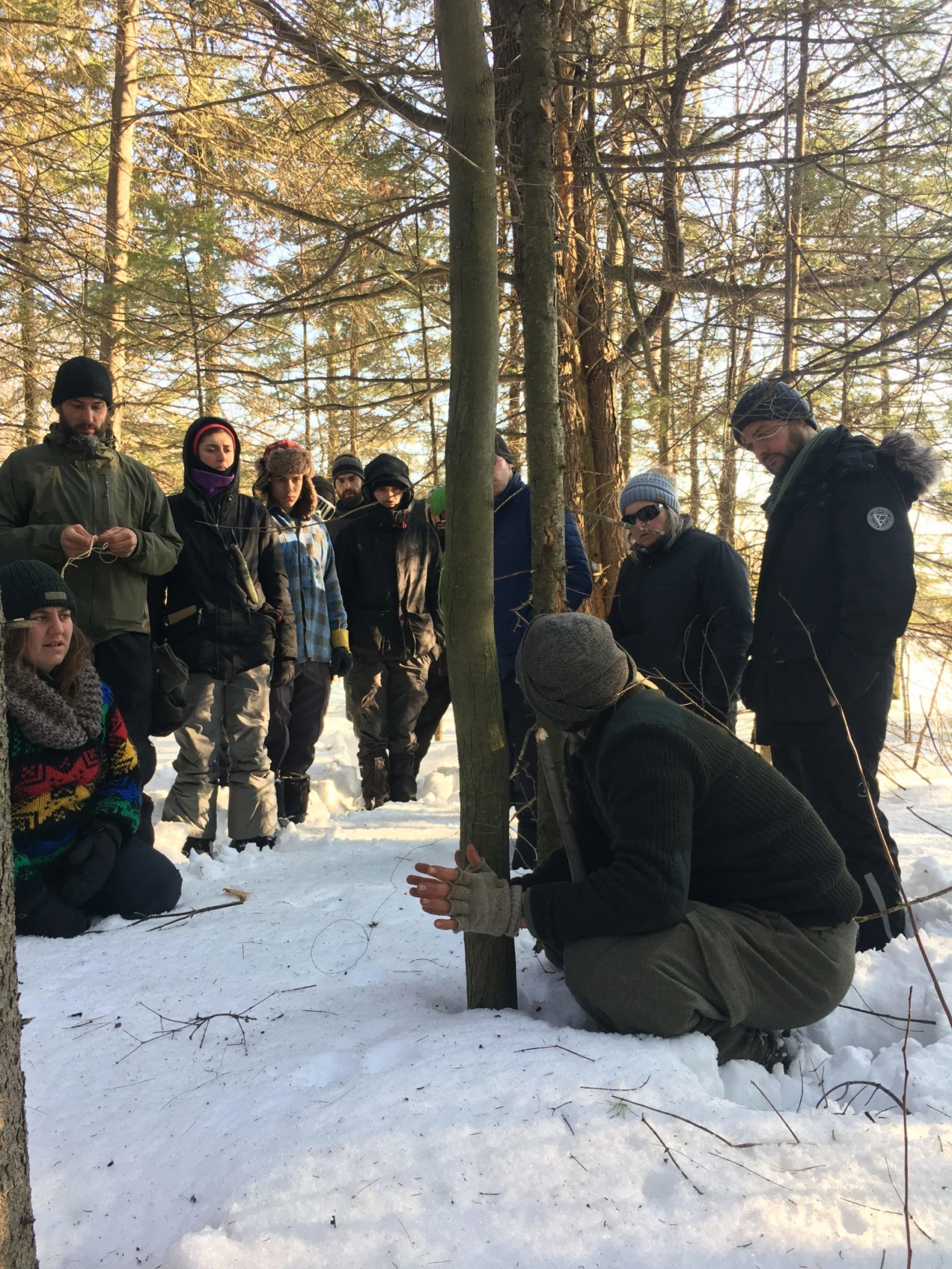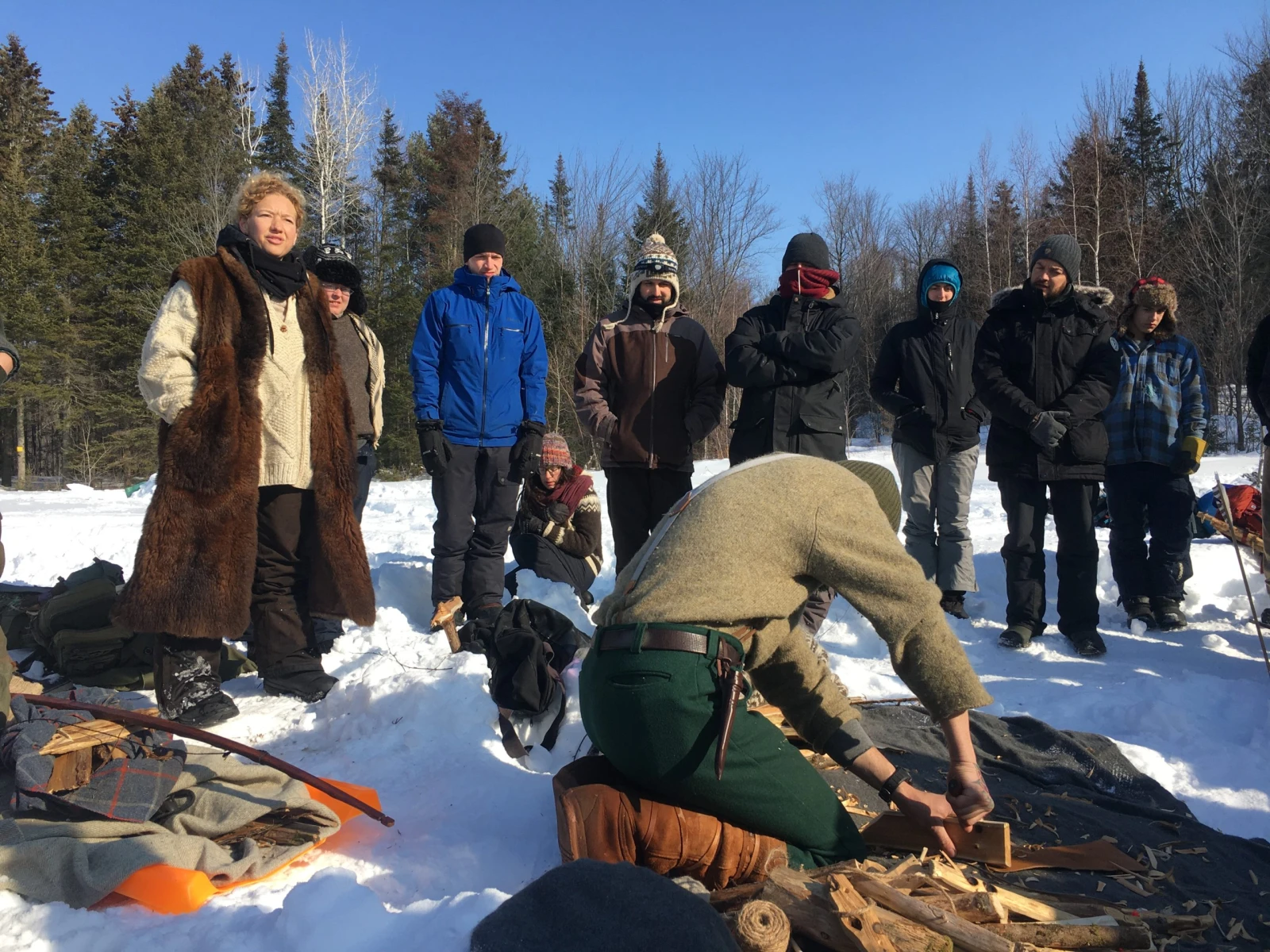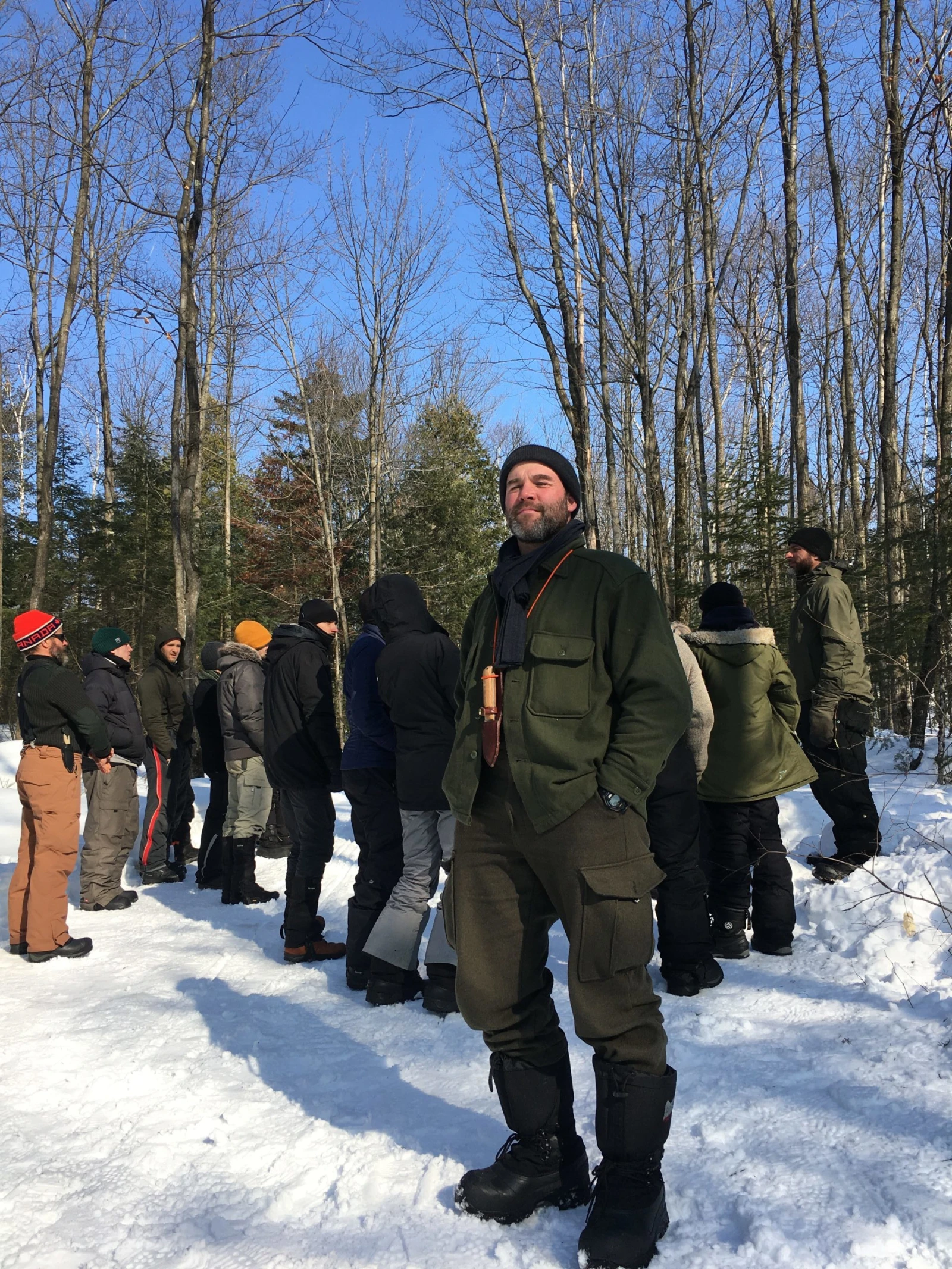Le temps est doux et le soleil, radieux, mais c’est l’hiver pareil. Résultat : mes pieds commencent déjà à geler dans mes bottes enfoncées dans la neige pendant que Geneviève évoque les quatre piliers de la survie : abri, feu, eau et nourriture. « Vous allez dépasser vos limites! Vous êtes chanceux, il ne fait pas froid, mais il y aura d’autres défis comme l’humidité. » Elle énumère les quelques règlements de la formation, qui concernent notamment le respect des femmes : « Messieurs, les femmes sont ici pour la formation. Ce n’est pas une agence de rencontre ». Désolé mesdames, mais même l’apocalypse ne vous sauvera pas des gars lourds.