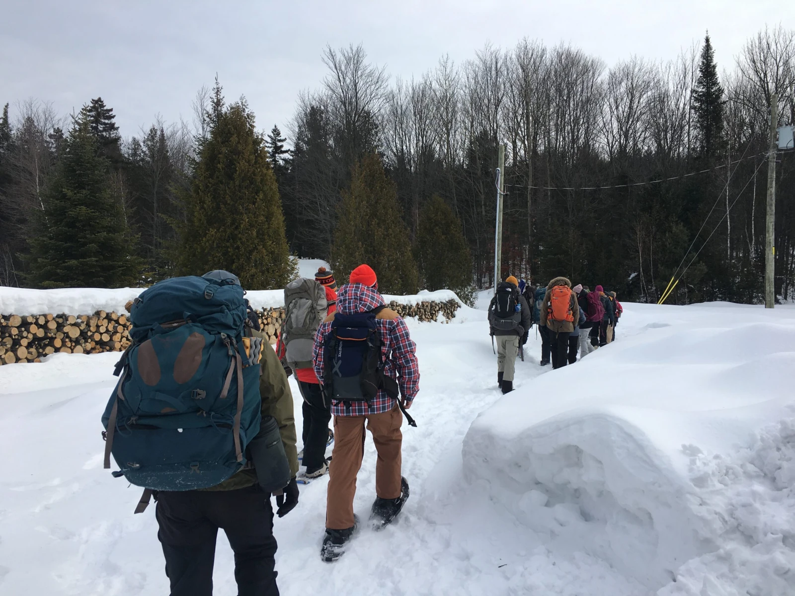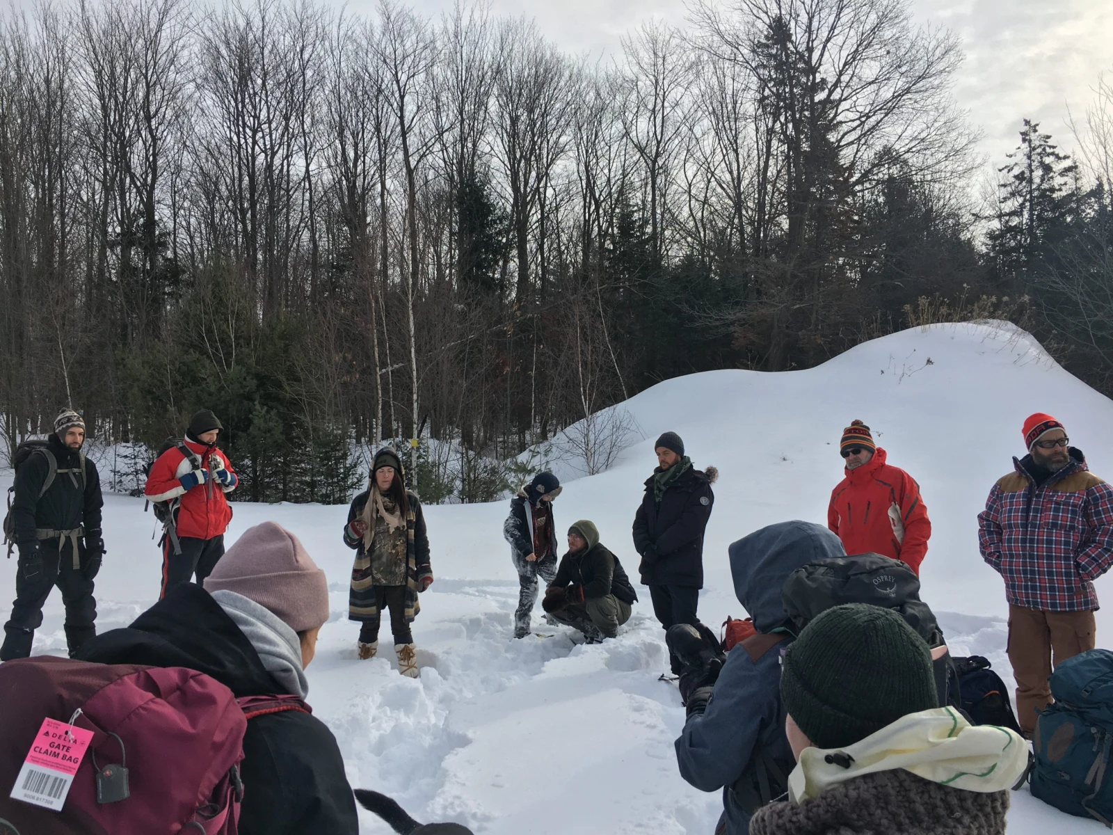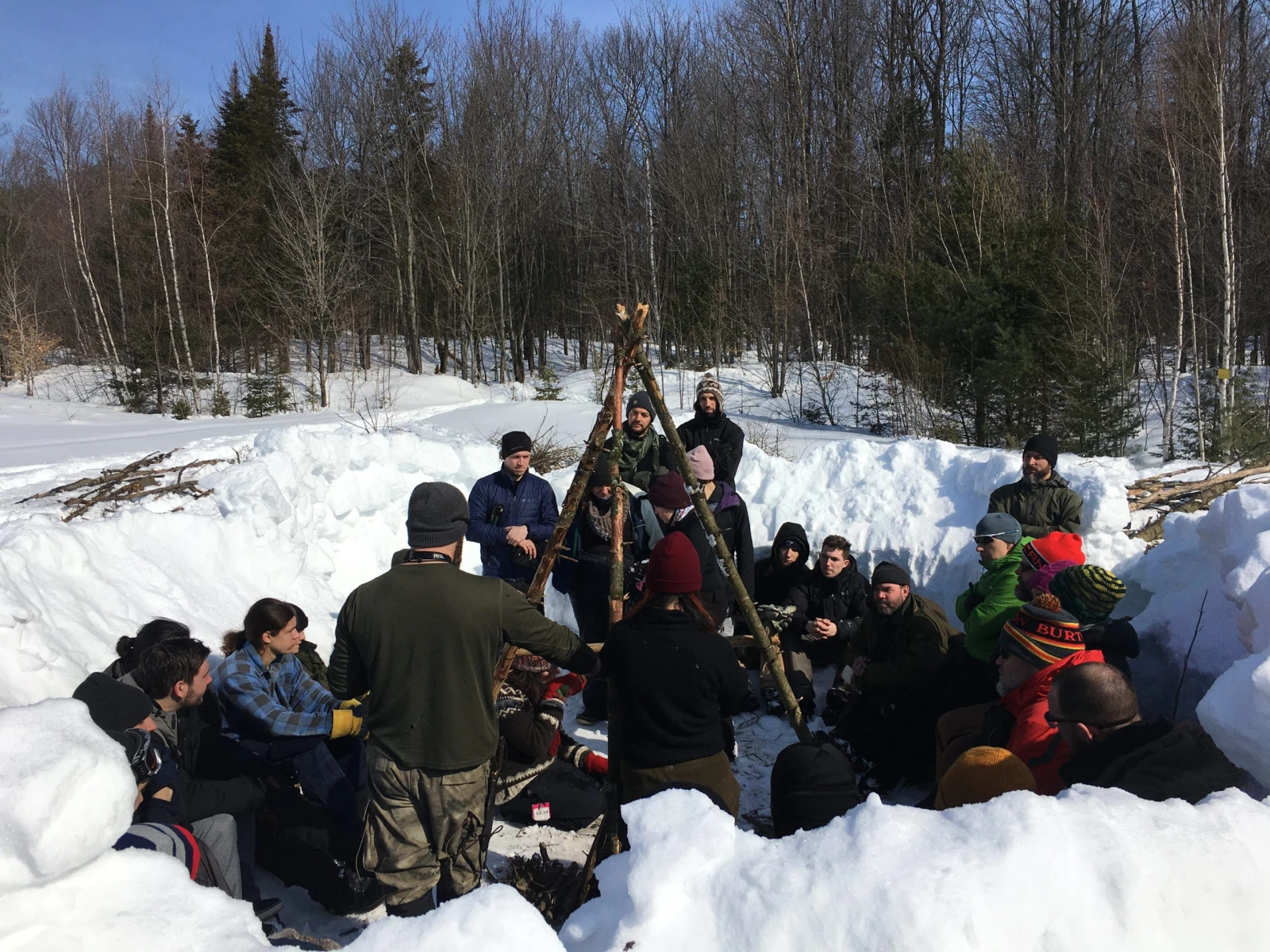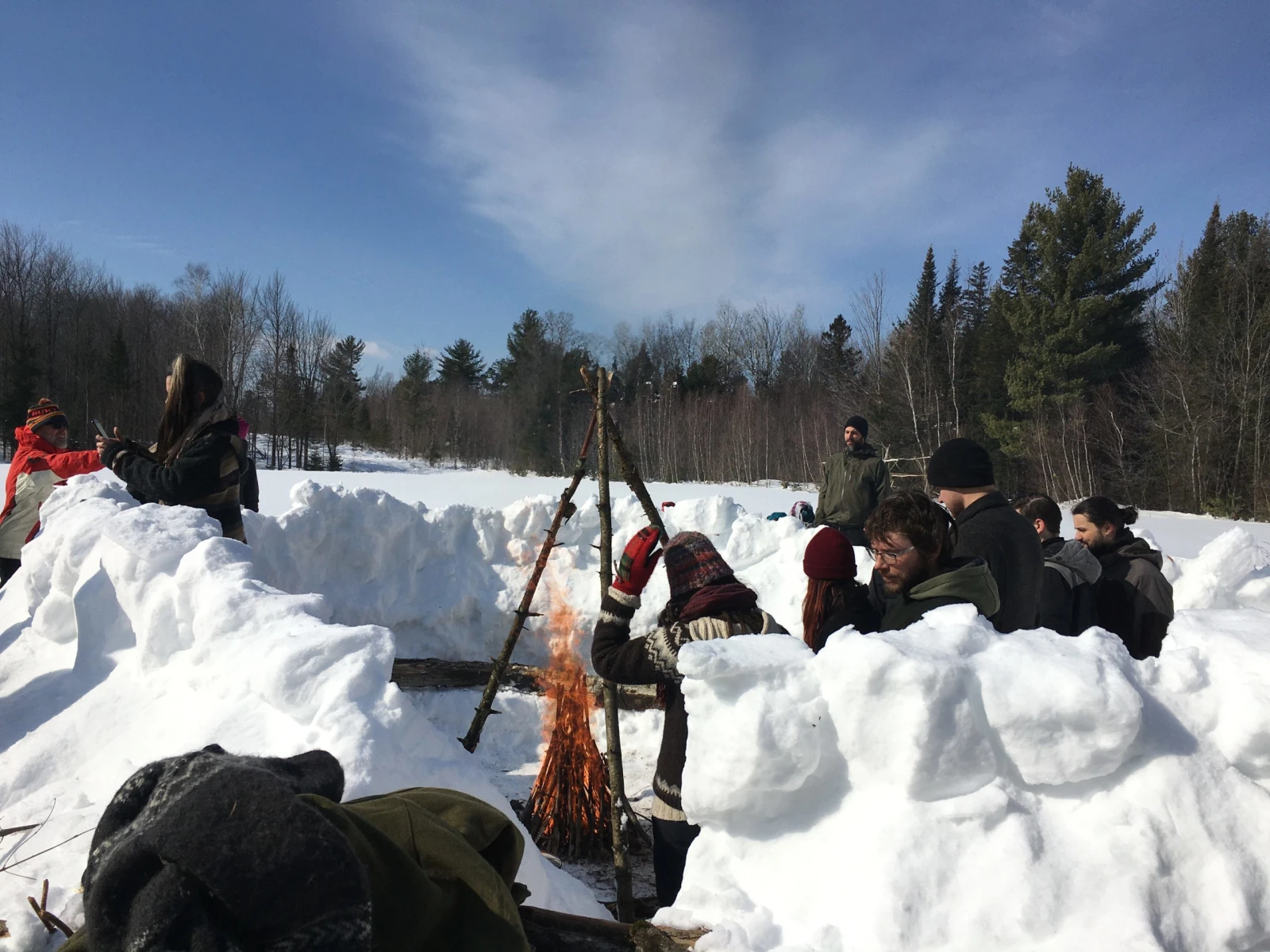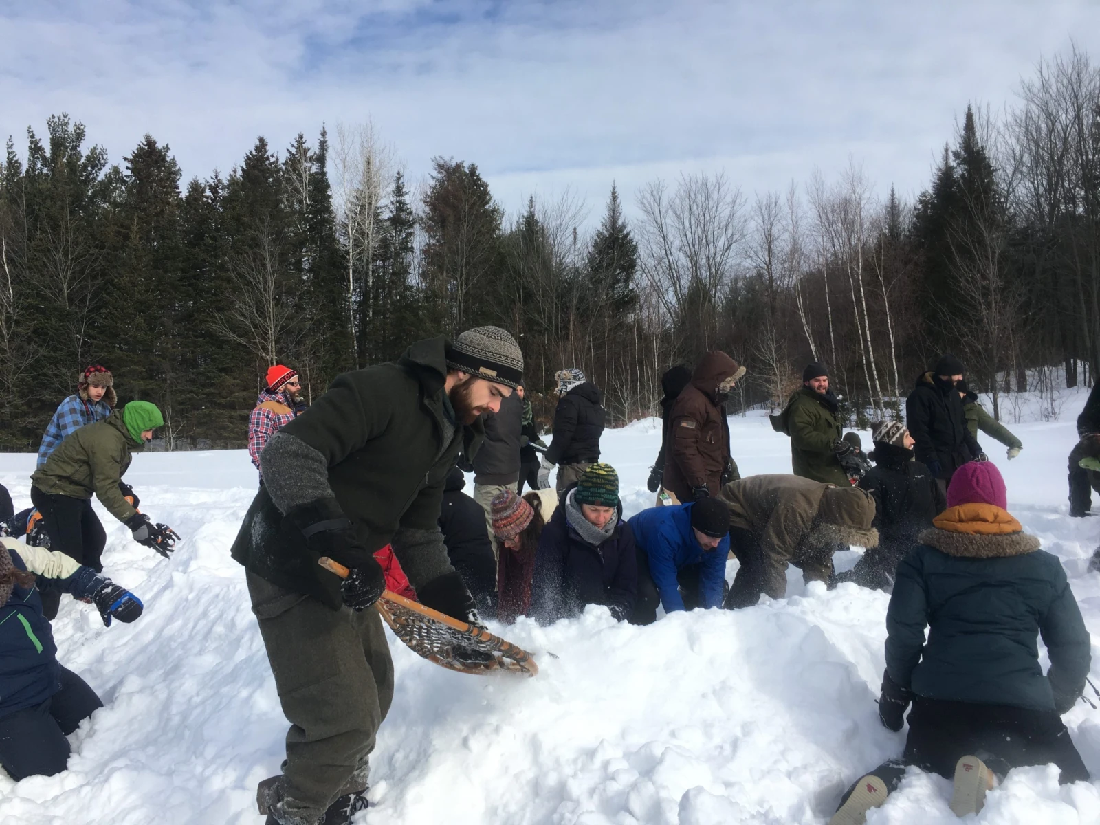 Notre première mission est d’aménager à l’endroit même où nous sommes, au milieu d’un champ, un lieu de rassemblement baptisé « la salle de classe ». Pas de pelle, pas le choix de se démerder avec les moyens du bord. On pousse la neige pour ériger des murs avec nos mains, nos pieds et, pourquoi pas, nos raquettes (ceux qui en ont). On découpe avec nos bottes des blocs de neige qu’on empile les uns sur les autres. En moins d’une heure, on a bâti un impressionnant abri circulaire avec des murs d’environ 5 pieds, assez haut pour se protéger du vent si on s’assoit à l’intérieur.
