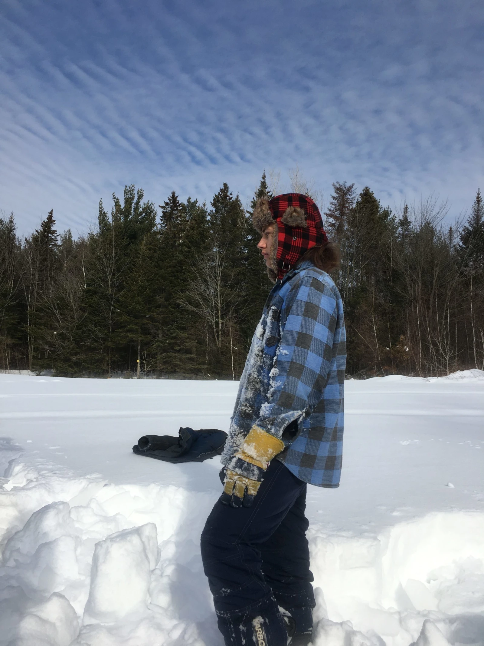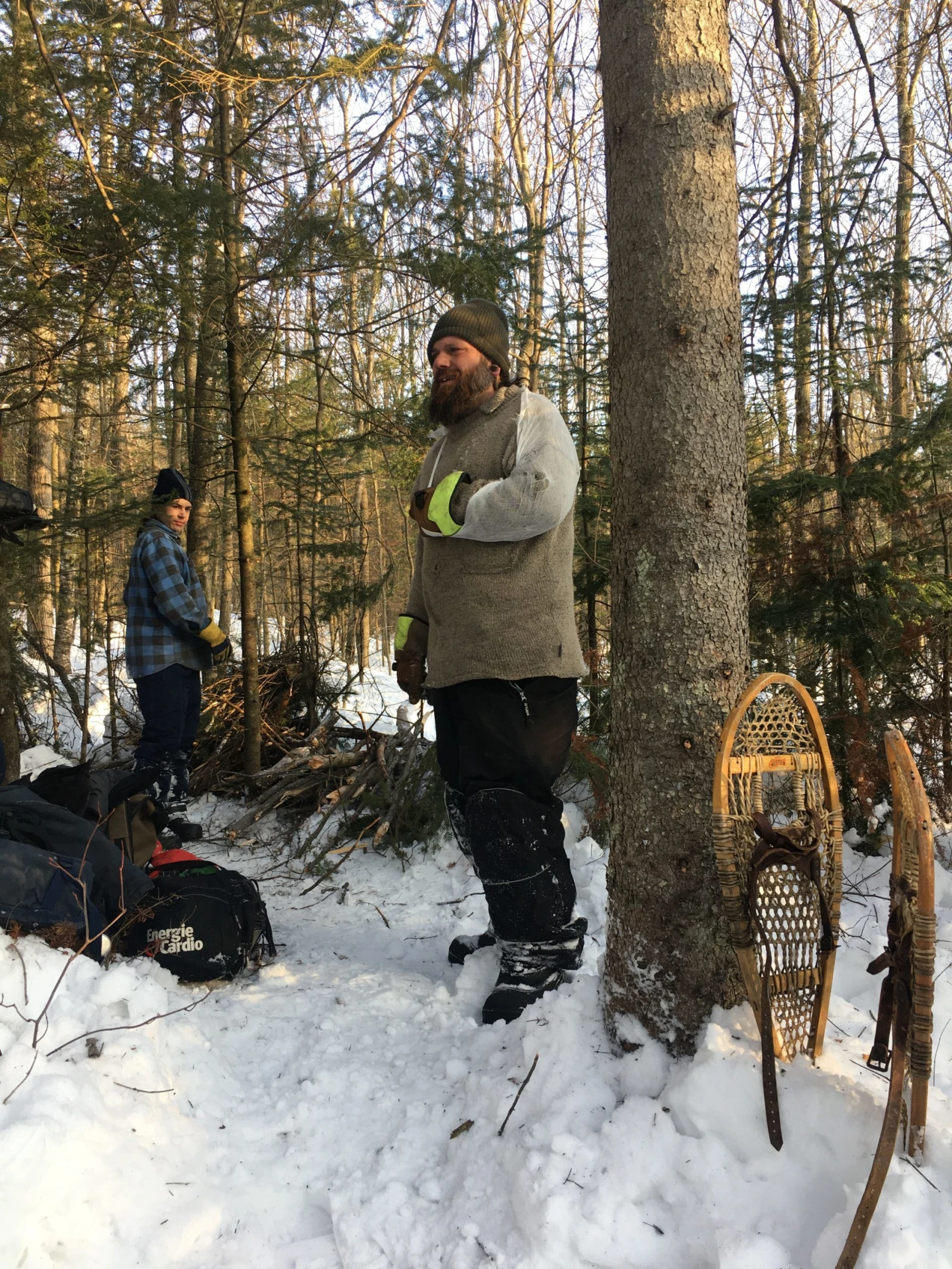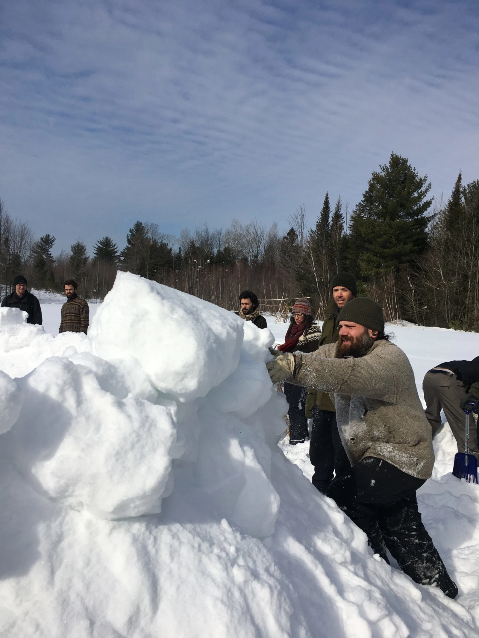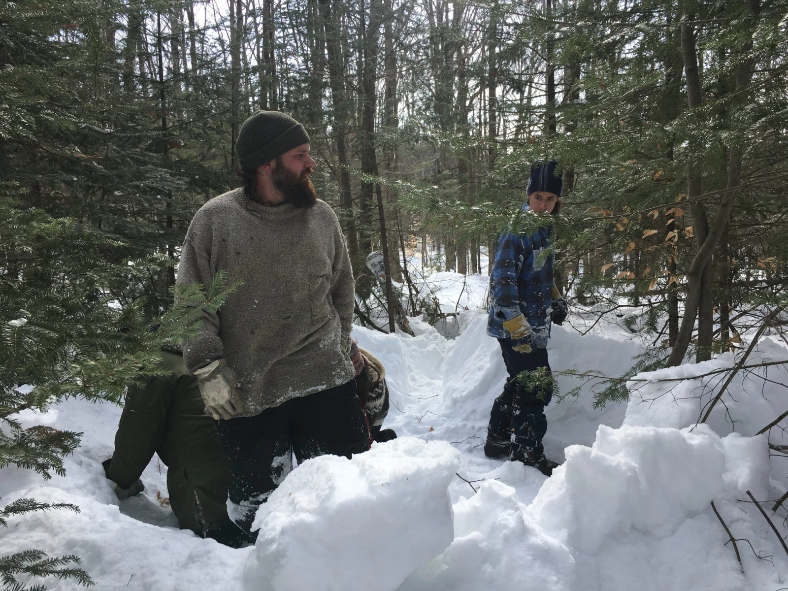 On s’enfonce dans la forêt en quête d’un endroit propice. Gaël trouve une sorte de clairière au milieu des arbres, à quelques mètres d’un sentier de motoneige. Charlot, un gaillard à la barbe hirsute de Saint-Alexis-des-Monts, commence déjà à pousser de la neige pour monter les murs, imité par son fils.