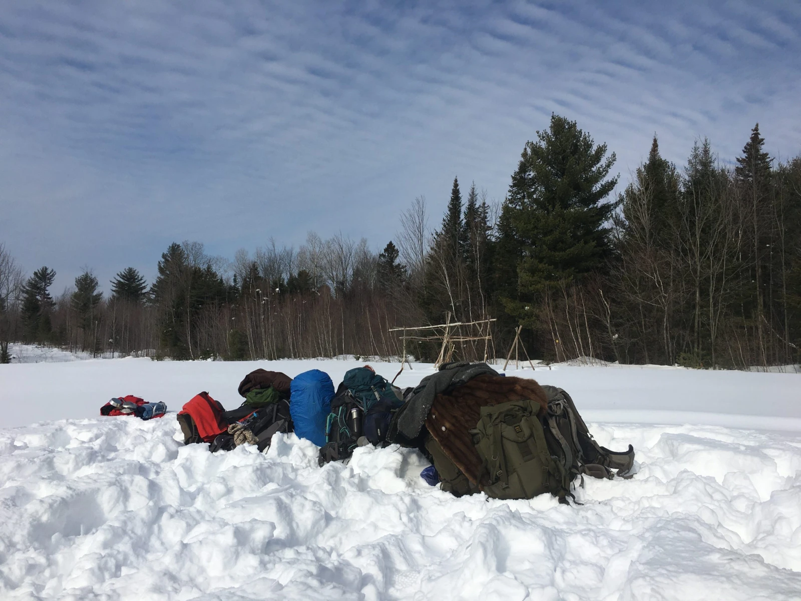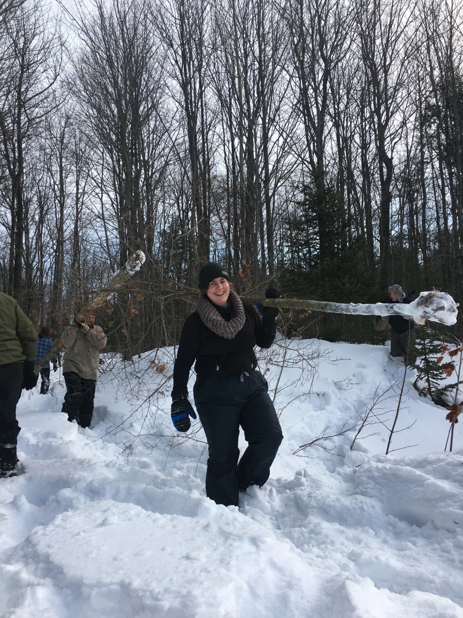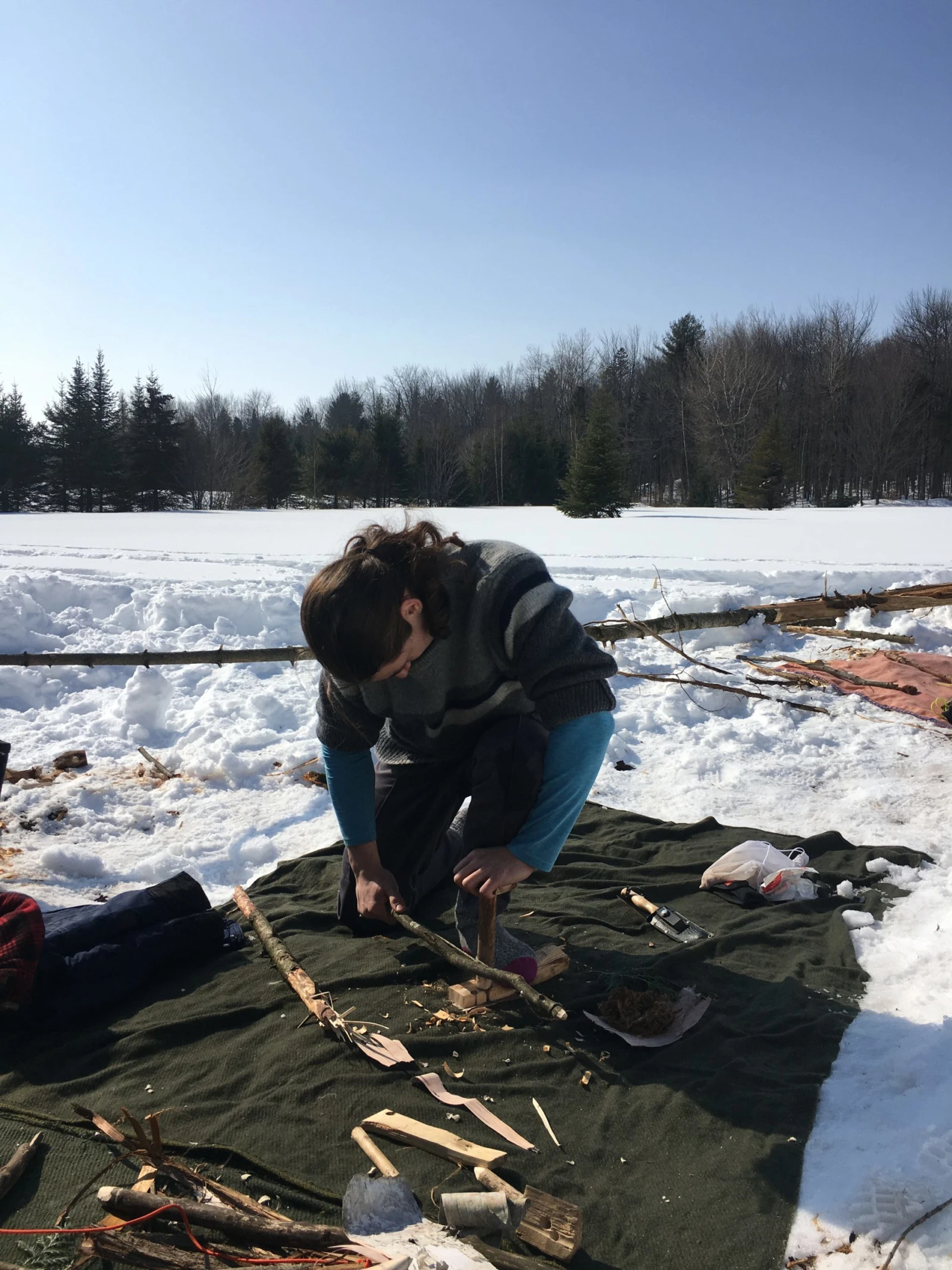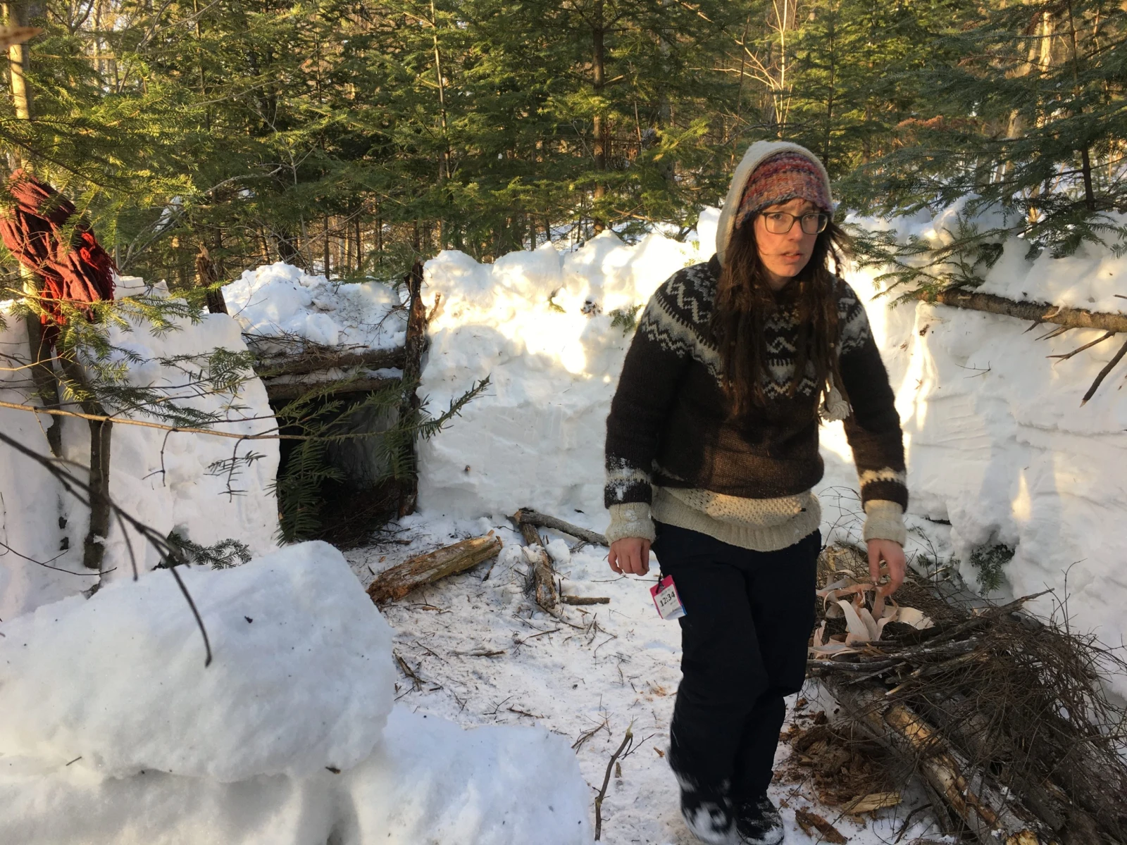 Deuxième mission : ramasser du bois. Comme le feu au centre de l’abri doit brûler toute la nuit, il en faut beaucoup. Pour trouver les branches et rondins nécessaires, il faut avancer dans la neige folle, parfois jusqu’à la taille. Mais à la gang, on parvient en une trentaine de minutes à en charrier des montagnes, réparties ensuite par grosseurs.