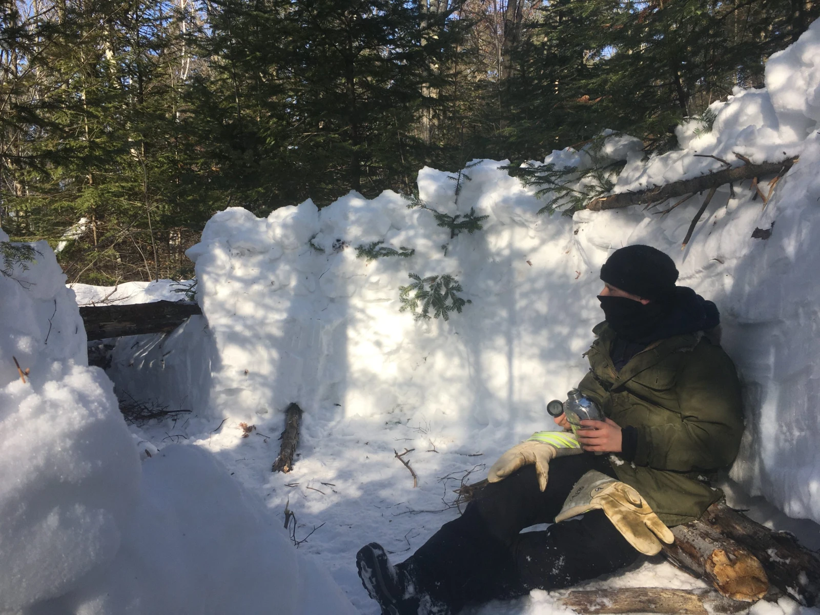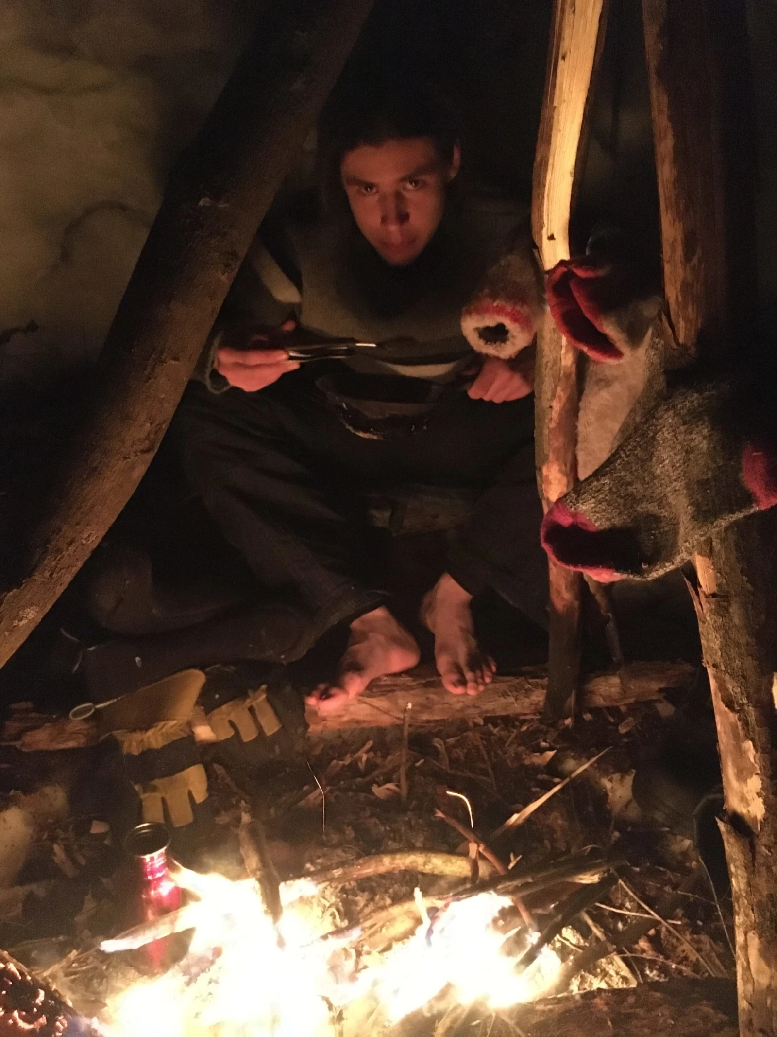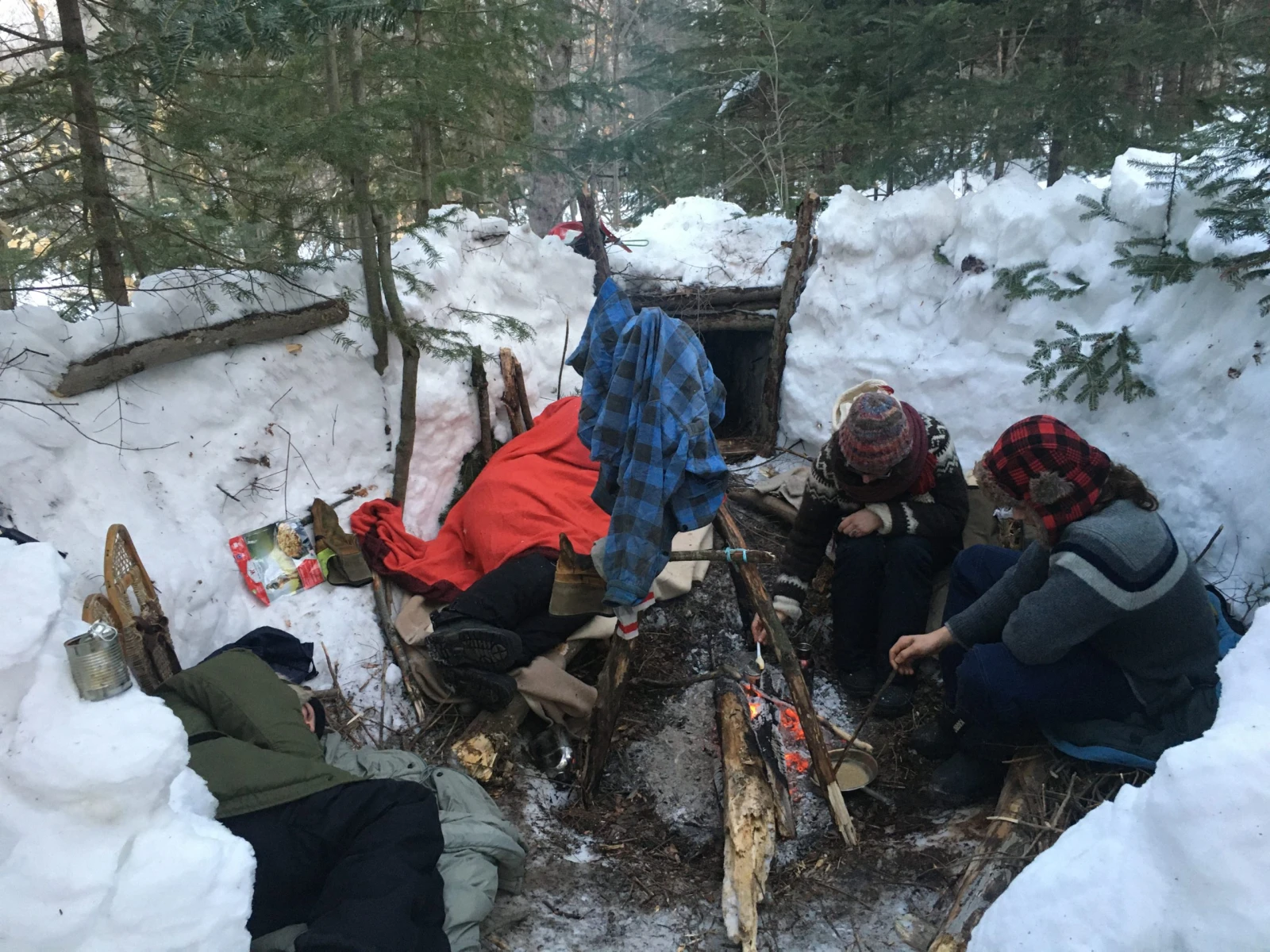 Il avance rondement d’ailleurs. On est de loin la meilleure équipe, grâce à Gaël, notre survivant né. L’autre ado, Yohan, se débrouille pas mal aussi et ramasse des « balais de sorcière ». Ces petites branchailles serviront de lit dans notre « tombeau », un espace recouvert d’un toit de feuilles, de bois et de neige qui peut accueillir une personne à la fois à tour de rôle pour un peu plus de confort. Les autres dormiront autour du feu dans l’abri, à la belle étoile. Sans sleeping bag, je tiens à rappeler.