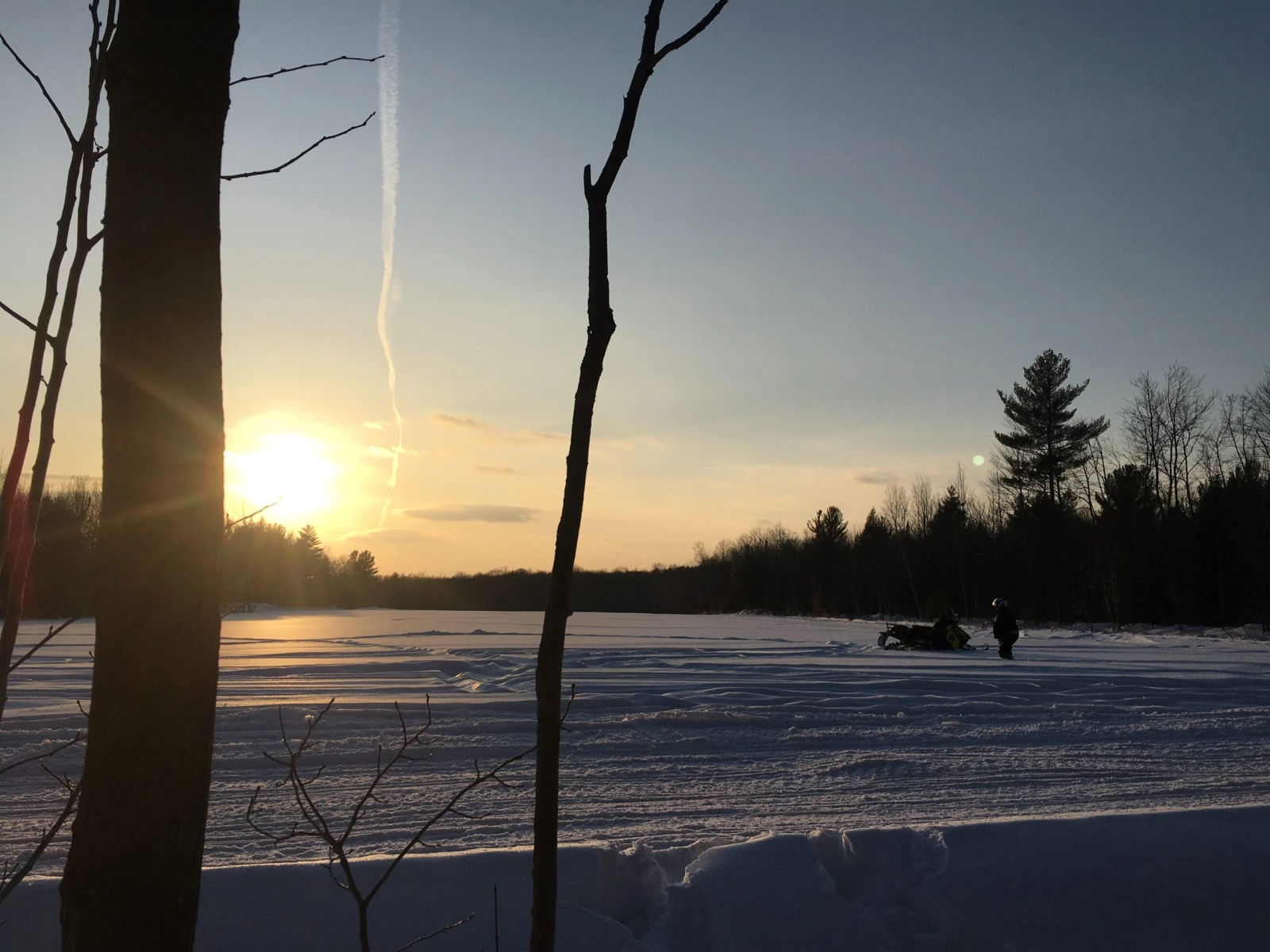 Mais c’est aussi magnifique. Le jour tombe et un ciel de feu disparaît derrière le sol immaculé et la cime des épinettes. Un motoneigiste s’arrête pour immortaliser la scène avec son téléphone.