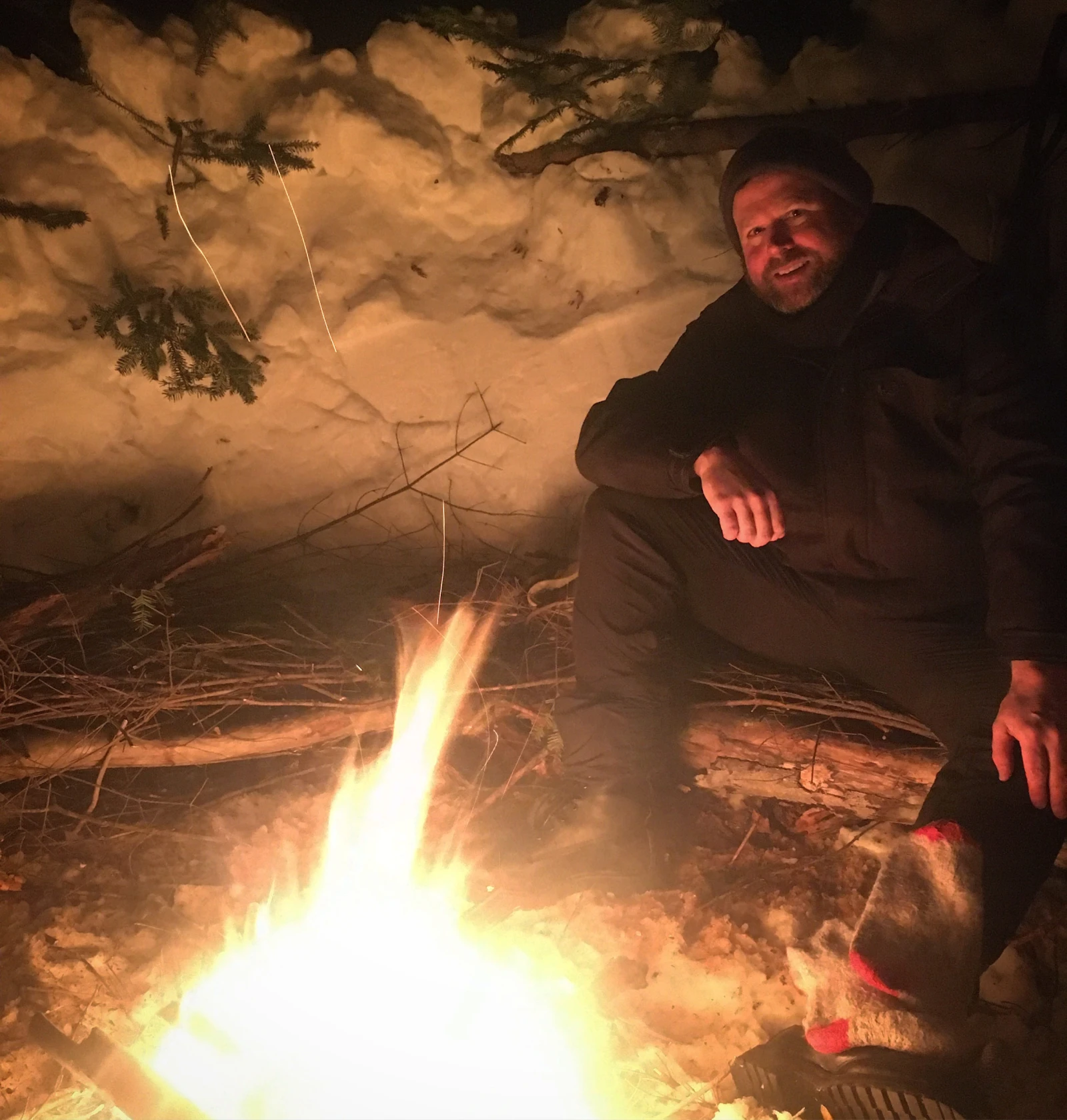 Gaël est déchaîné. Il vient de bricoler un support à vêtements au-dessus du feu avec son couteau, du bois et de la corde, en plus de faire chauffer son eau pour cuire sa soupe. Je fais aussi chauffer de la neige pour mélanger à ma lasagne déshydratée du Canadian Tire. Le résultat est moins appétissant que sur la photo, mais ça va.