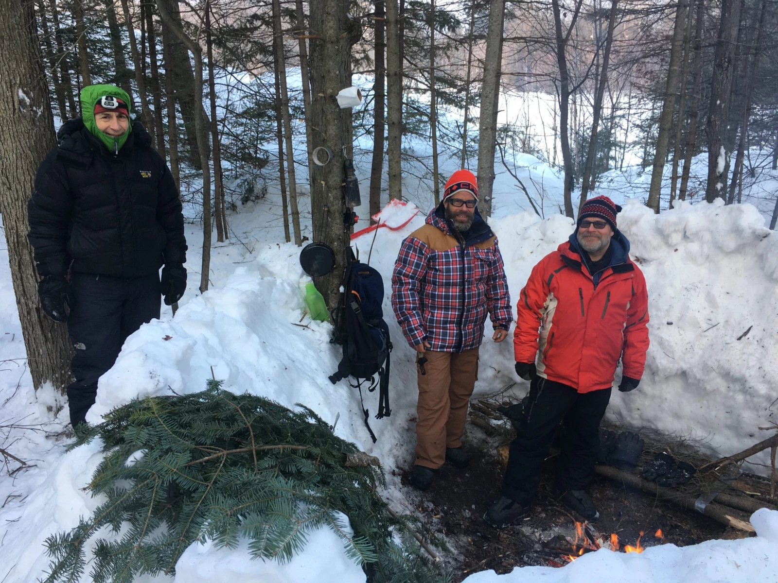 Je visite les frères Plantes à leur campement pas loin. Hugo veille le feu, Francis a sommeillé un peu, mais pas autant que Rambo qui a dormi comme un loir dans l’abri en retrait qu’il s’était patenté. Pas étonnant pour ce maniaque de plein air, qui a escaladé des sommets vertigineux un peu partout dans le monde.