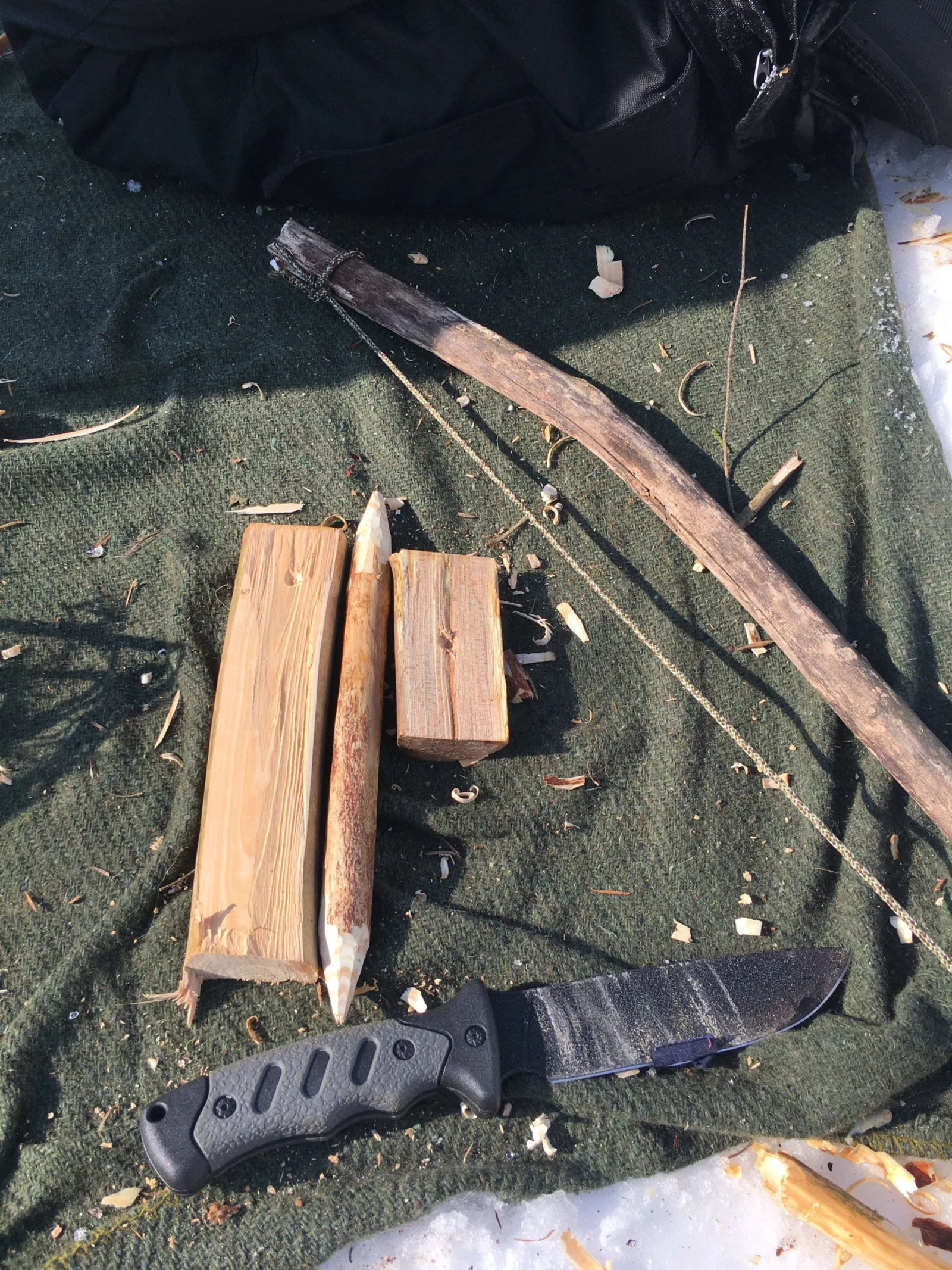 Après avoir gossé mes outils avec mon couteau, je réussis à faire de la fumée, mais pas à allumer le petit lit d’écorce qui n’attendait pourtant que ça. Quelques participants y arrivent du premier coup, notamment un des frères Plante.