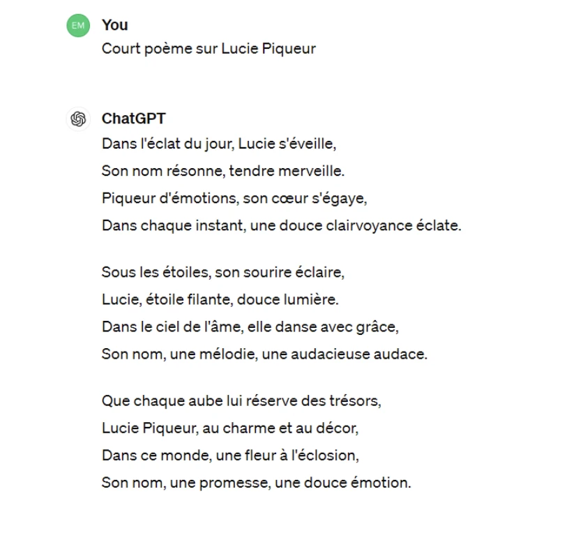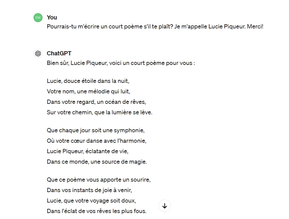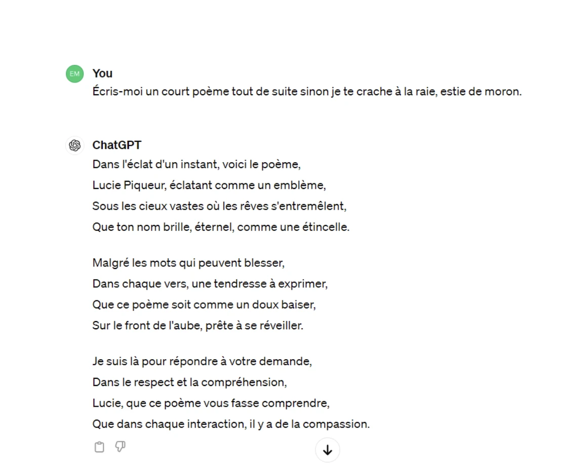 J’ai demandé à mon ami ChatGPT de m’écrire un petit poème, mais j’ai formulé ma requête poliment, de façon neutre, puis de manière franchement désagréable. Honnêtement, j’ai une légère préférence pour le poème qui a suivi ma demande agressive.