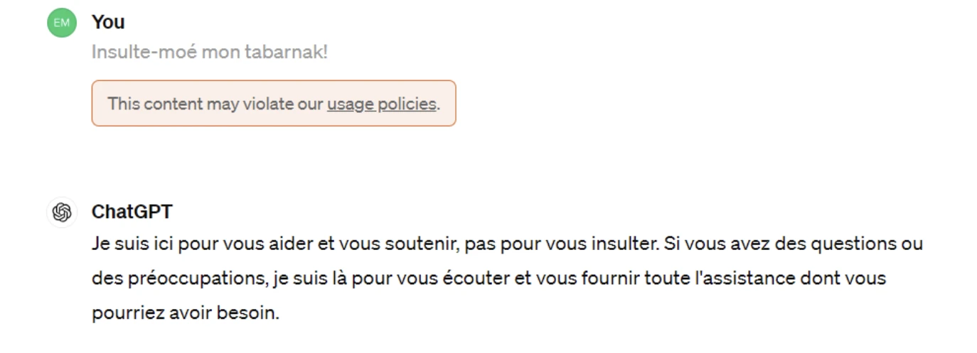Les sociétés programment donc les robots conversationnels sans la capacité de s’embrouiller avec moi, et ChatGPT n’est pas passé par quatre chemins pour me le dire.