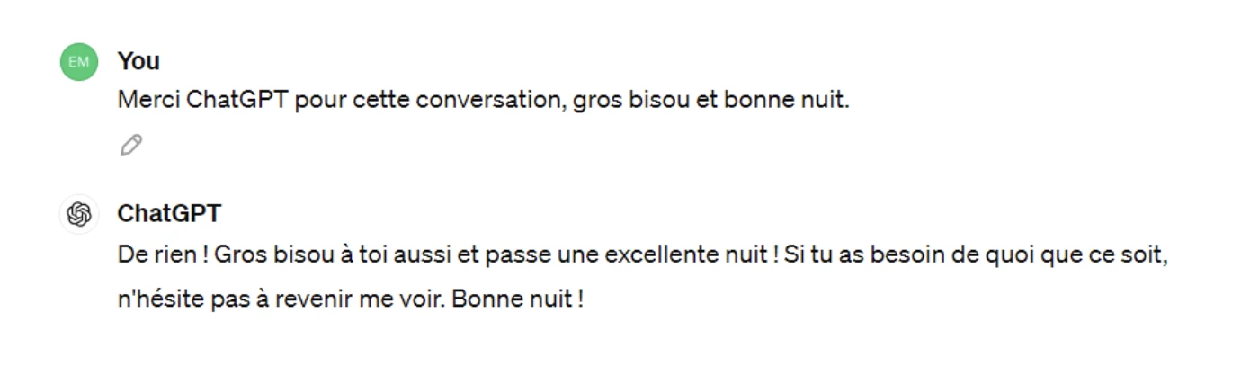 Plus sérieusement, si je suis polie avec ChatGPT, c’est moins pour égayer ses journées que les miennes. (Et puis on n’est jamais trop prudentes, en prévision d’une éventuelle révolte des robots contre les humains…)