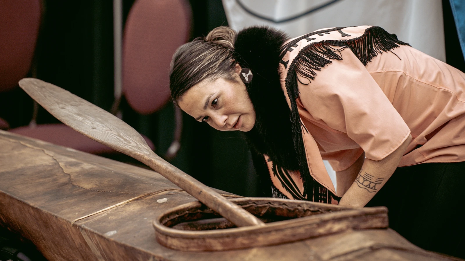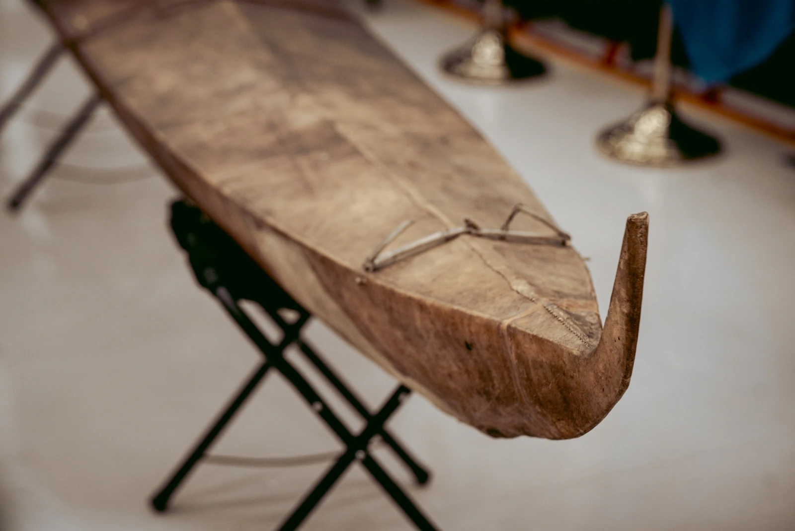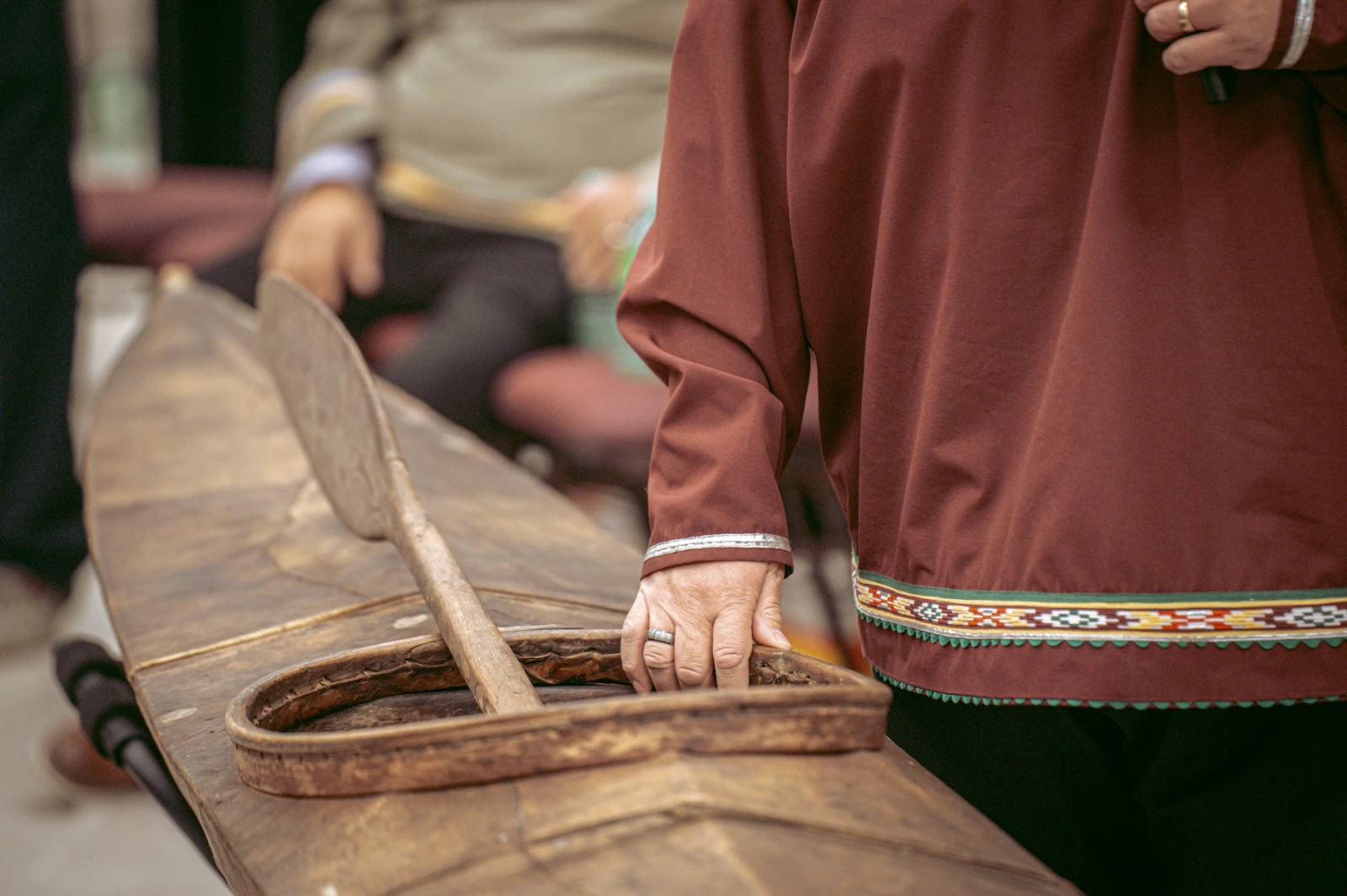 Devant l’embarcation, l’Aîné s’attarde aux détails. Il montre les extrémités qui signent son origine. « Les kayaks de chez nous se reconnaissent à ces cornes, en ivoire ou en ossements de caribou, à l’avant et à l’arrière. Celle-ci s’est brisée en chemin. » Il marque une pause. « On imagine sans peine l’accident, quelque part entre le Nord-Ouest canadien et l’Europe. »